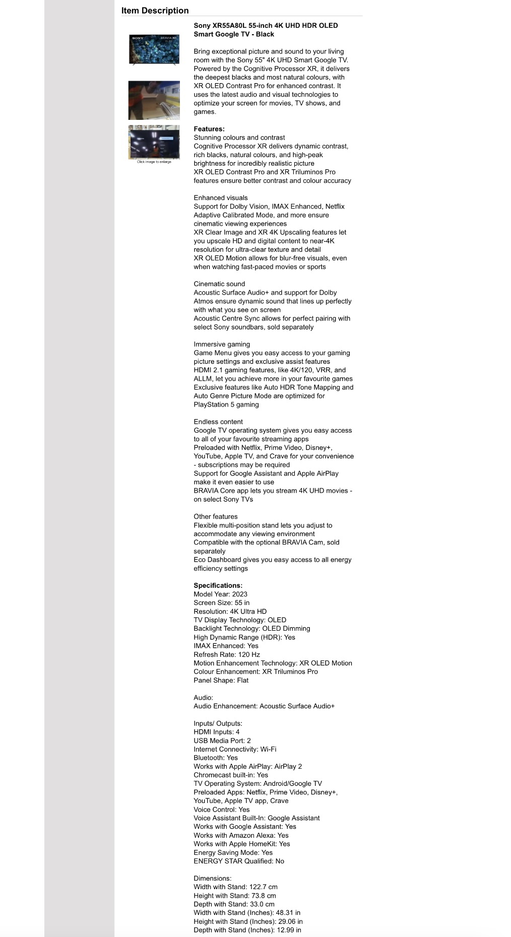 BRAND NEW IN BOX! All accessories sealed and included. MSRP $1,999.99 + tax BEST OFFER or FIRST COME! (Offers below $950 will not get a response) Items Included: Sony 55" A80L BRAVIA XR OLED 4K HDR TV Remote Stand Power Cord Items not included: Manuals and quick start guide Unit has been tested and is fully functional. There are minor styrofoam marks in a line on the bottom centre of screen (See images 8-9) & Minor scuff on bezel (image 10) from shipping. Styrofoam marks are difficult to spot when screen is on and does not impact pixels or functionality of screen. OEM box included. Pay via Cash, Credit, e-transfer, crypto, Apple Pay, & MORE! **Delivery and Shipping is possible depending on location and small fee. Delivery and shipping fees must be paid in advance by you regardless of purchase** https://www.sony.ca/en/bravia/products/a80l-a83l-a84l-series Caveat emptor It is the duty of the buyer to inspect, test, and agree to our products prior to completing transaction. You accept full responsibility of the product the second money exchanges hands even if you choose to not test and inspect. If the unit is factory sealed and you decide to break the seal to inspect and test, you agree to complete the sale as long as the product inside is in adequate condition.