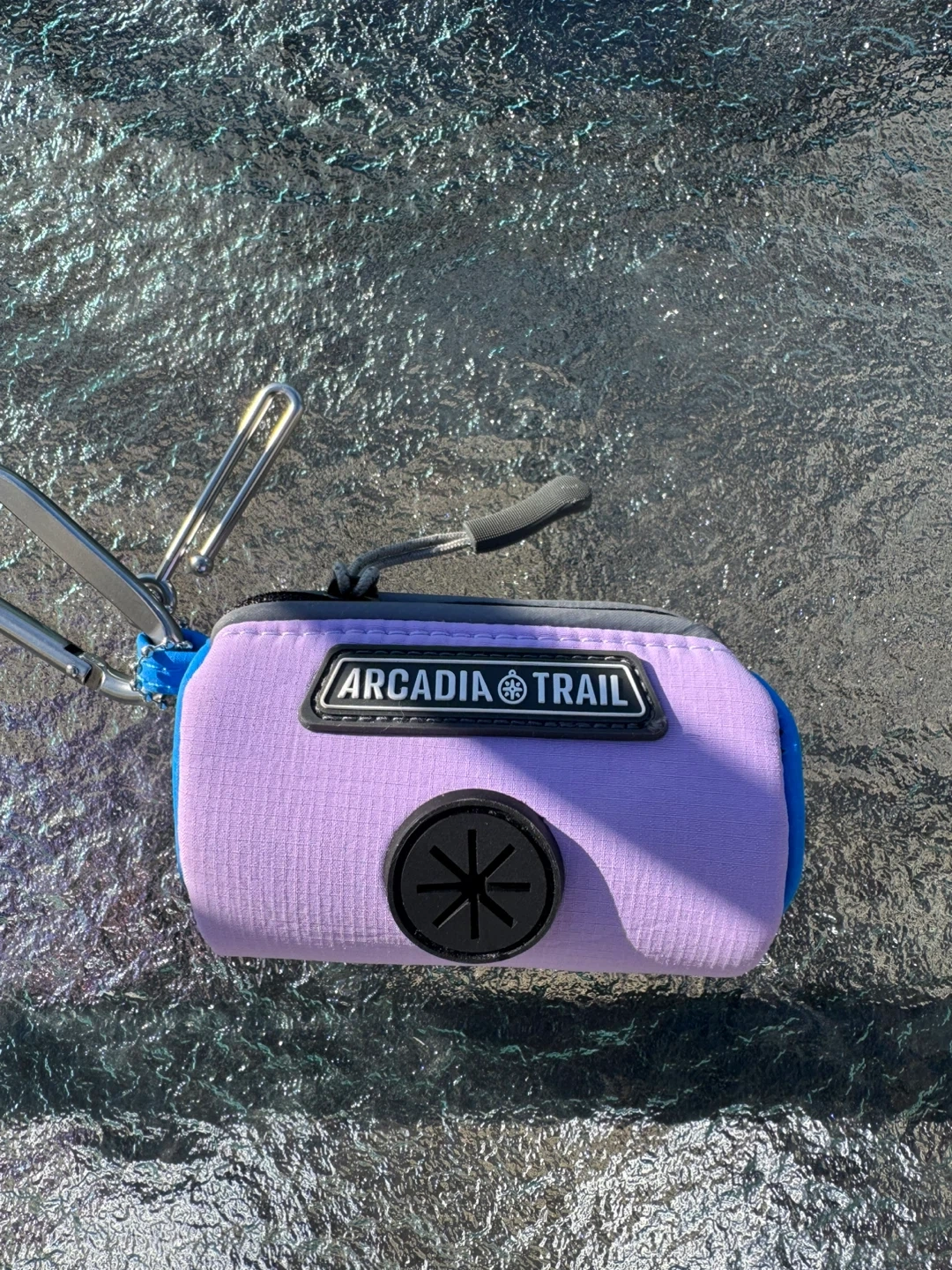 Arcadia Trail dog set includes a lavender and blue adjustable harness, a matching leash, and a waste bag dispenser with a roll of bags. This durable set is perfect for walks and outdoor adventures.