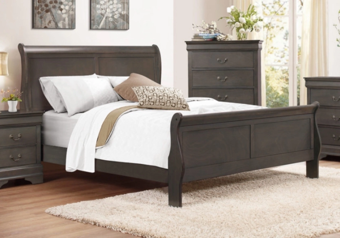 Elevate your bedroom with the elegant Mayville Collection bed frame, inspired by classic Louis Philippe styling. This traditional full sleigh bed features a timeless burnished stained gray finish, offering both style and durability.