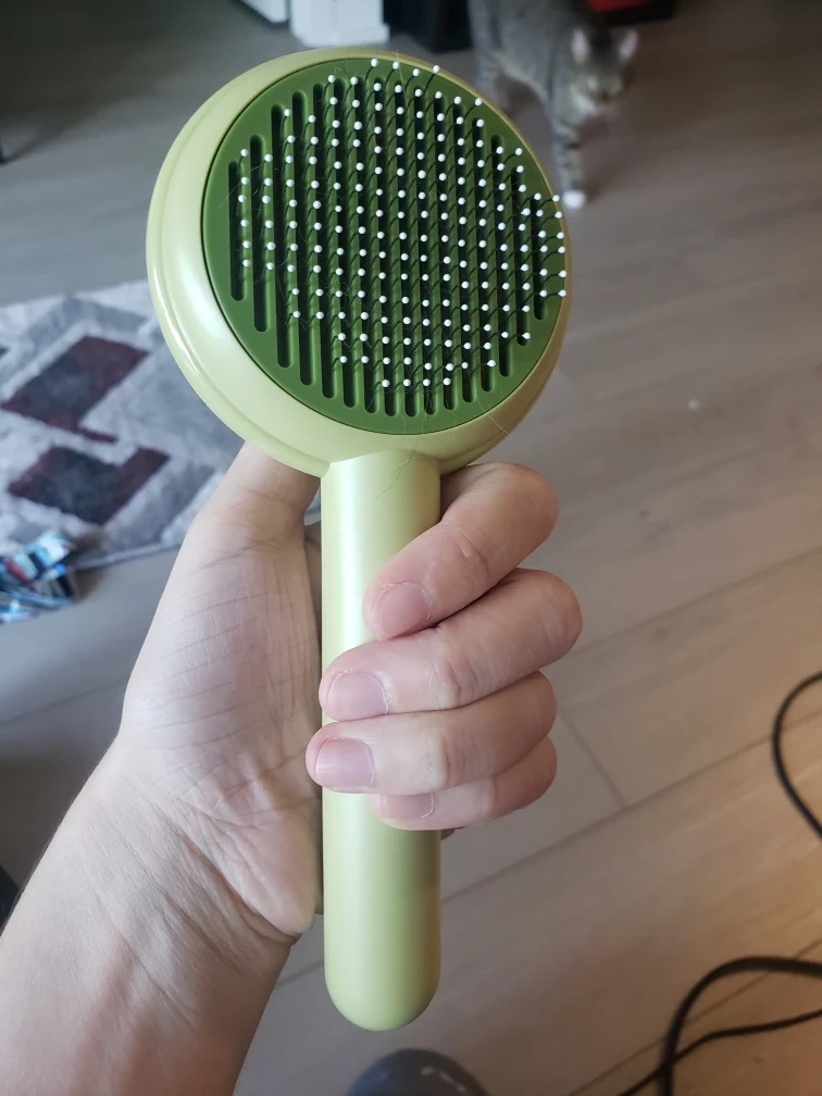 When you push the button on the back, a plate inside the brush pushes all the hair to the end of the tines, making it super easy to remove hair (see picture).