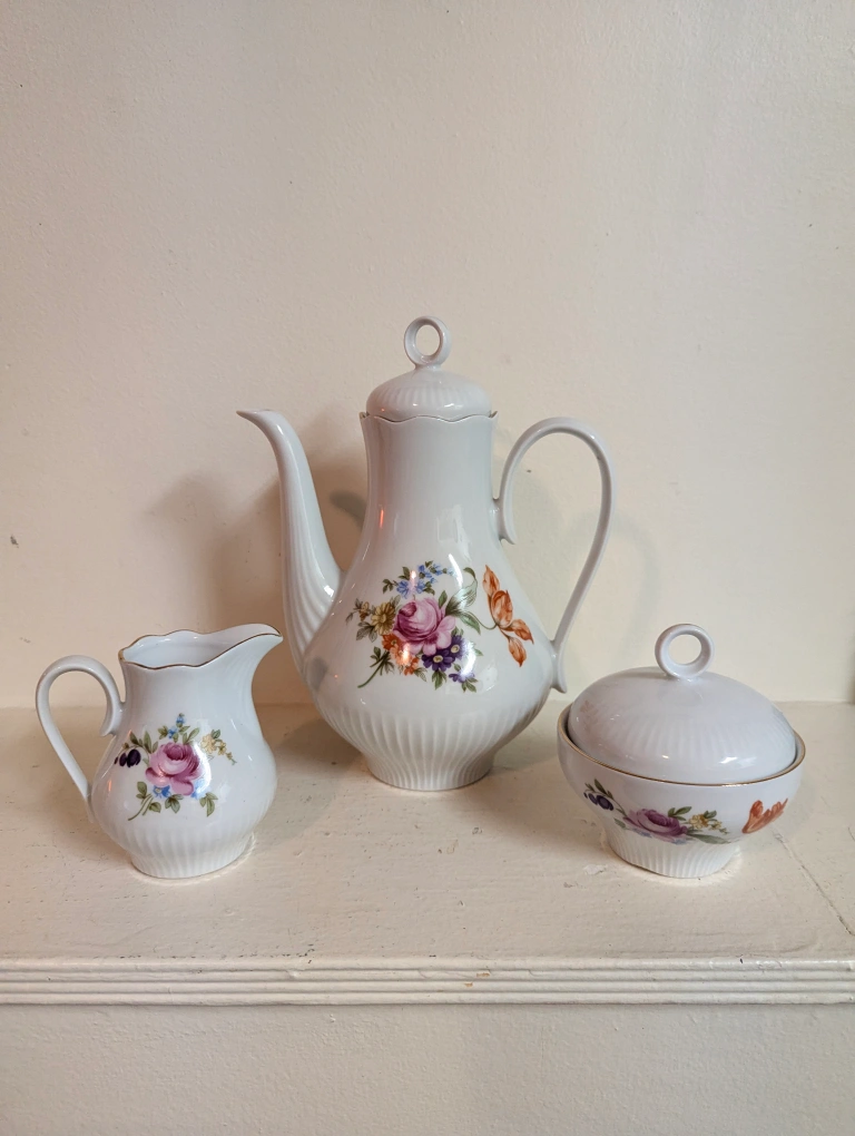 Vintage tea pot, creamer and sugar bowl set Jlmenau Ilmenau Germany Graf Von Henneberg. Hard to find very rare. Beautiful floral print. In like new condition.