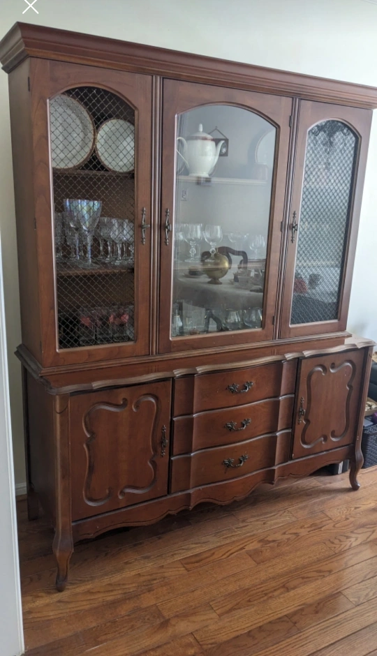 Moving Sale - Lovely three level display in three wire-decor doors, three pull-out drawers, two open up door cabinets.