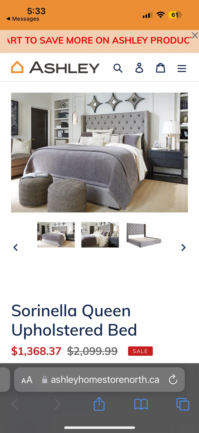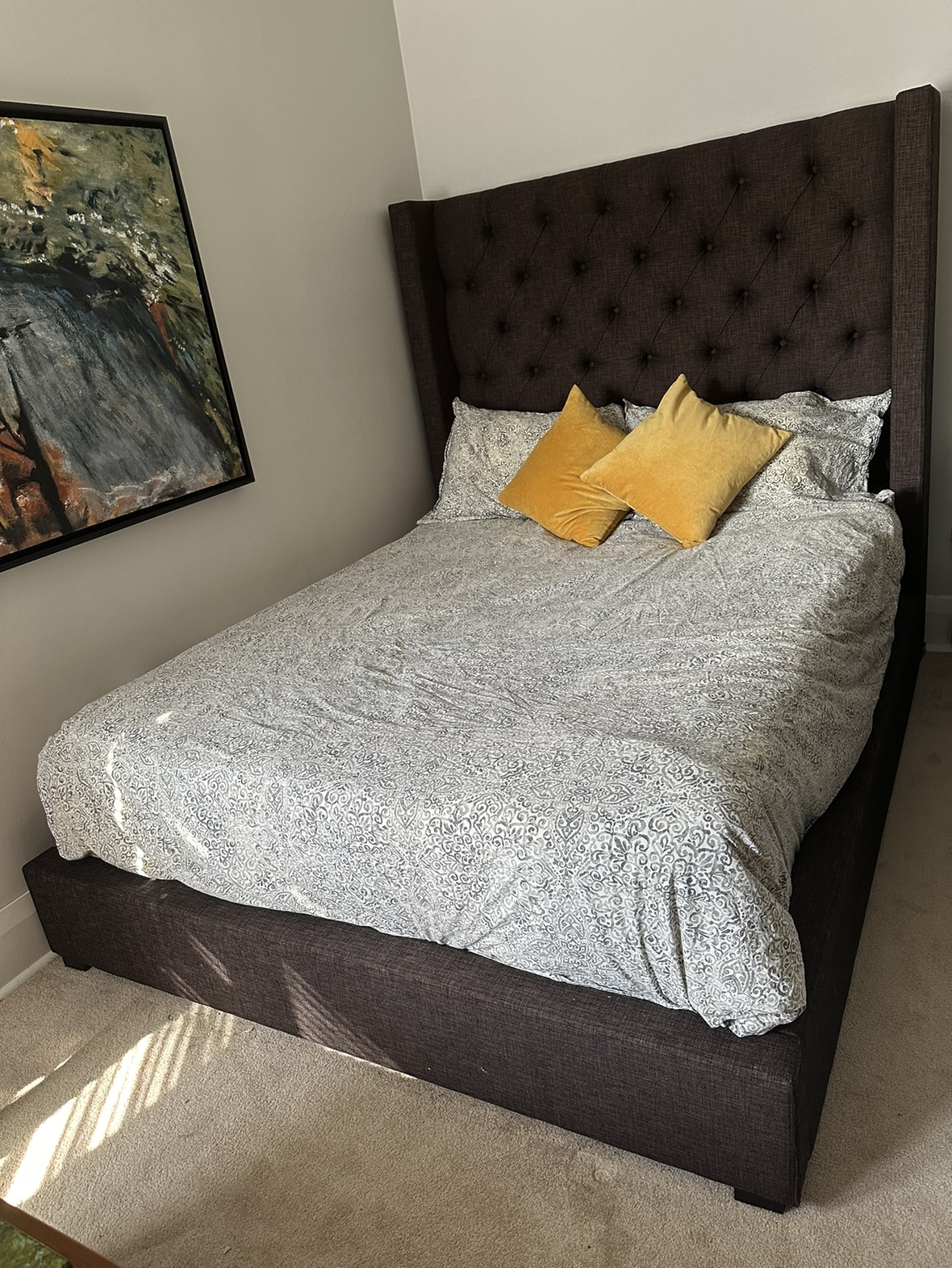 Brown upholstered headboard attached to bed frame. Like new. Does need a mattress (not included). Ashley furniture. They no longer carry the brown colour. Stunning!