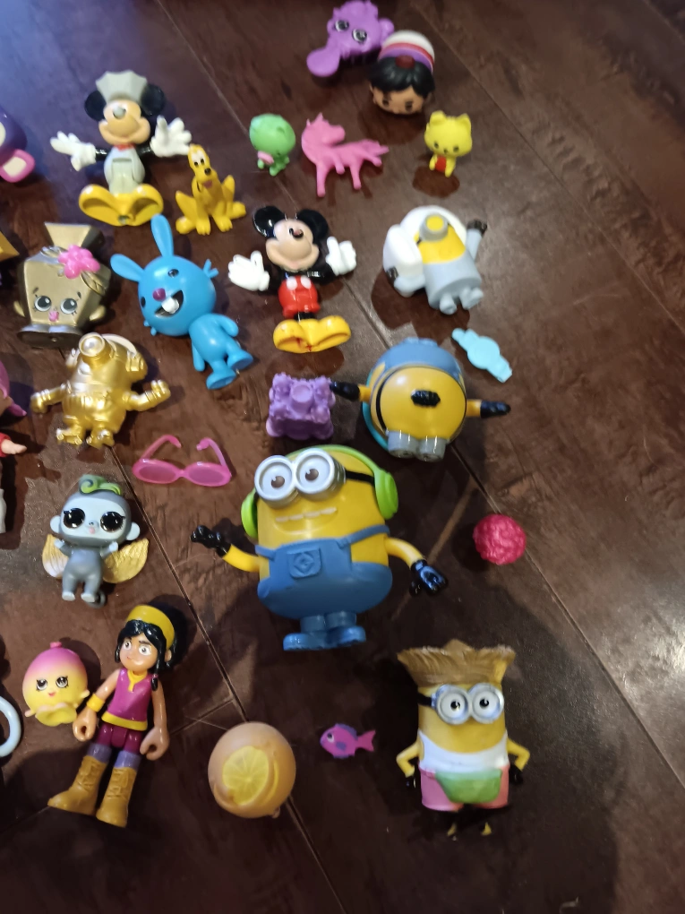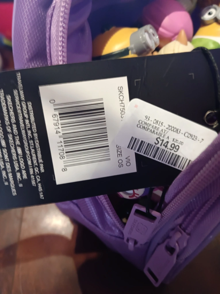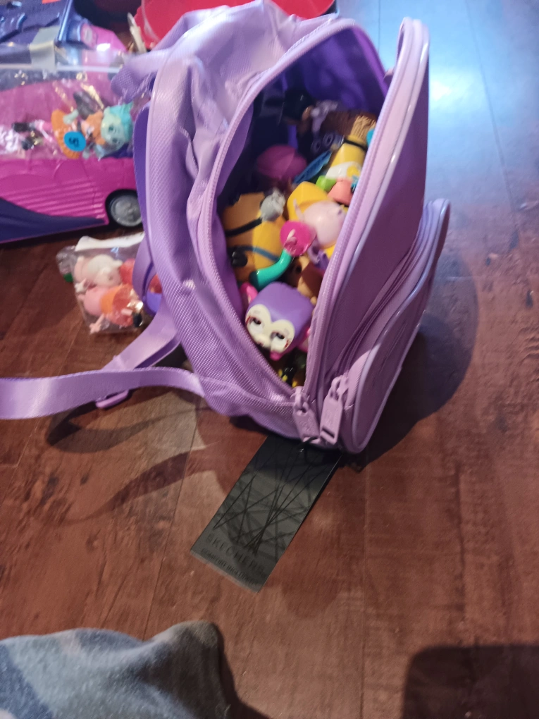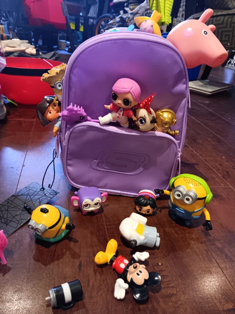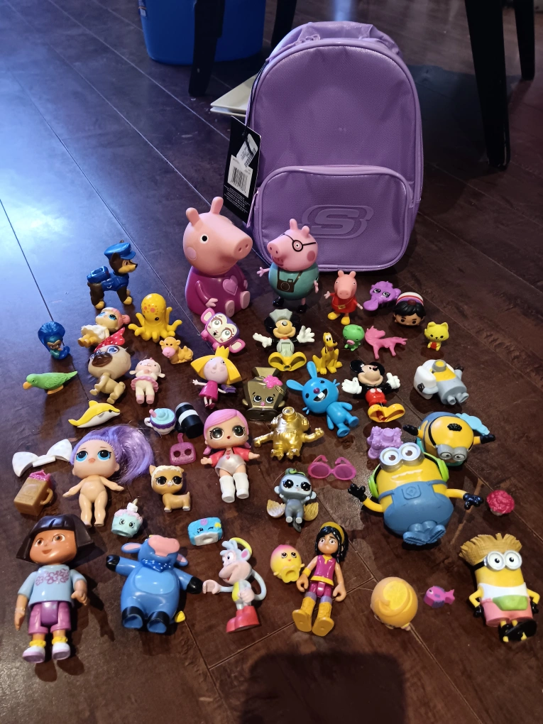 Lilac colored Sketchers mini back pack filled with assorted toys. included ..Dora..Peppa Pig and family..Minions..Benny the bull..Boots. Mickey Mouse.. LOL dolls ..ETC!