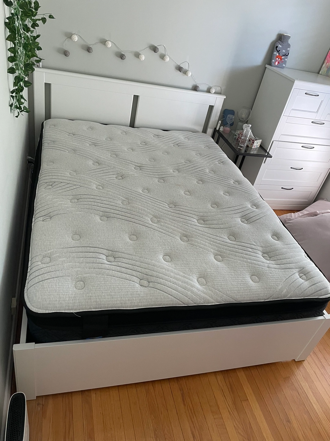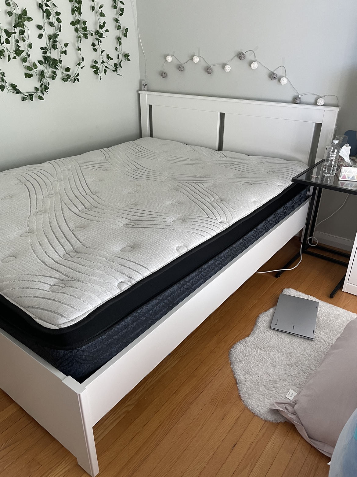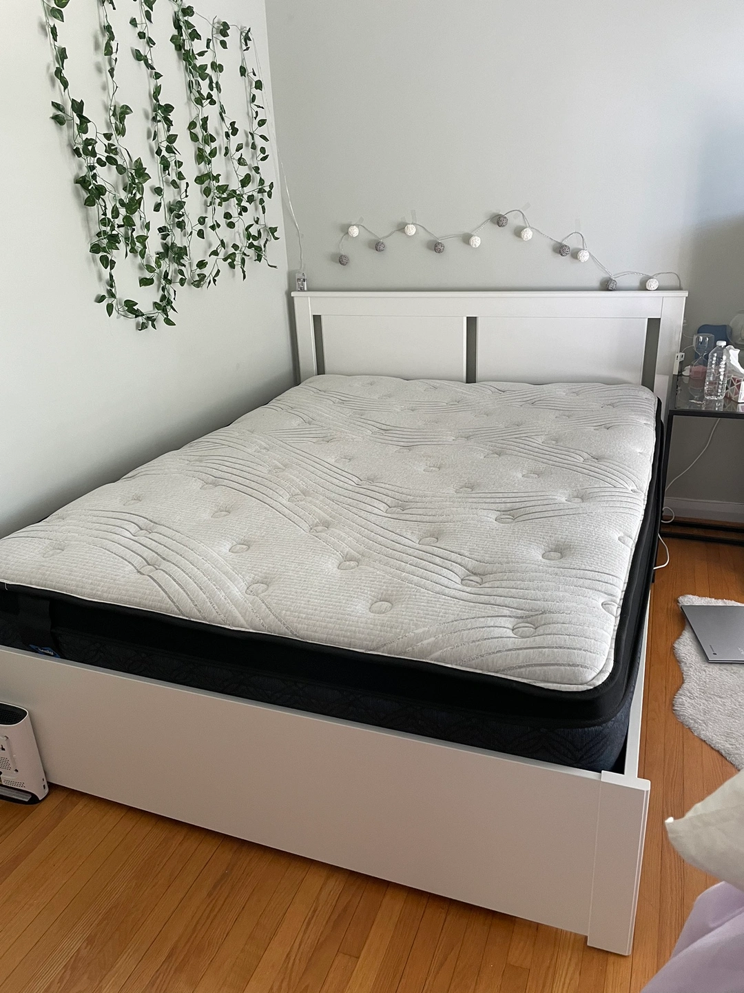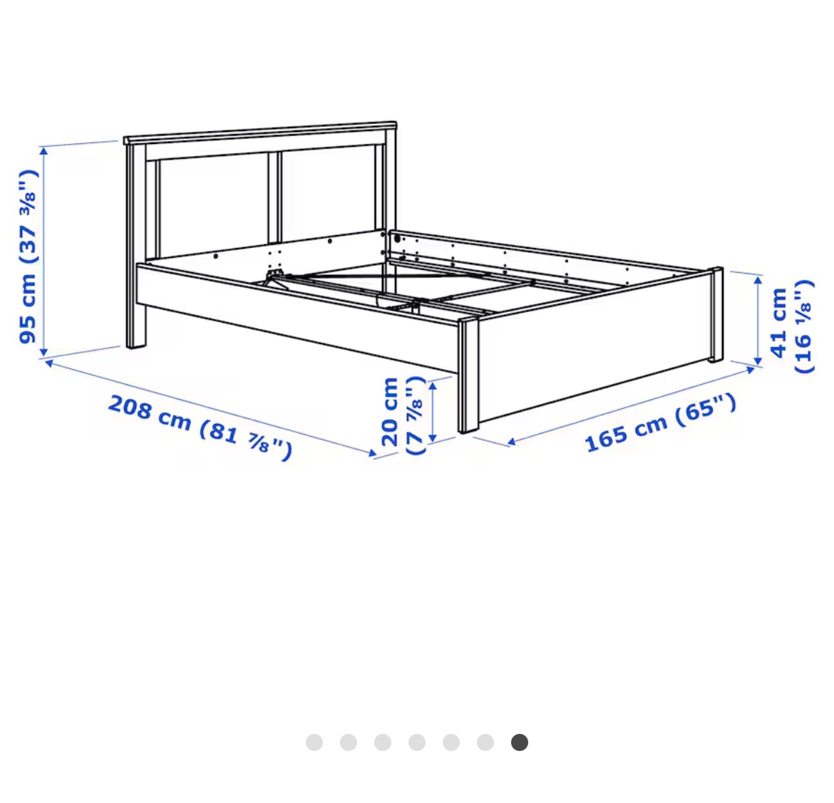 Frame + bed slats Like new. Very good condition. We are moving back to Europe, so we are selling all the furniture we bought here as we have no need or space to take it home. We are a pet-free, non-smoking household. Do you have any questions? Please let us know.