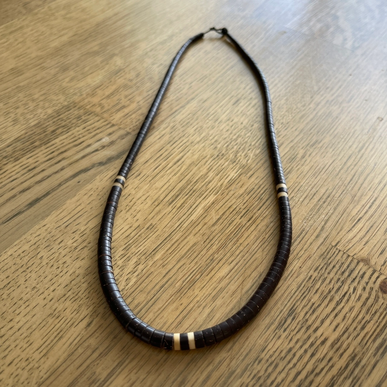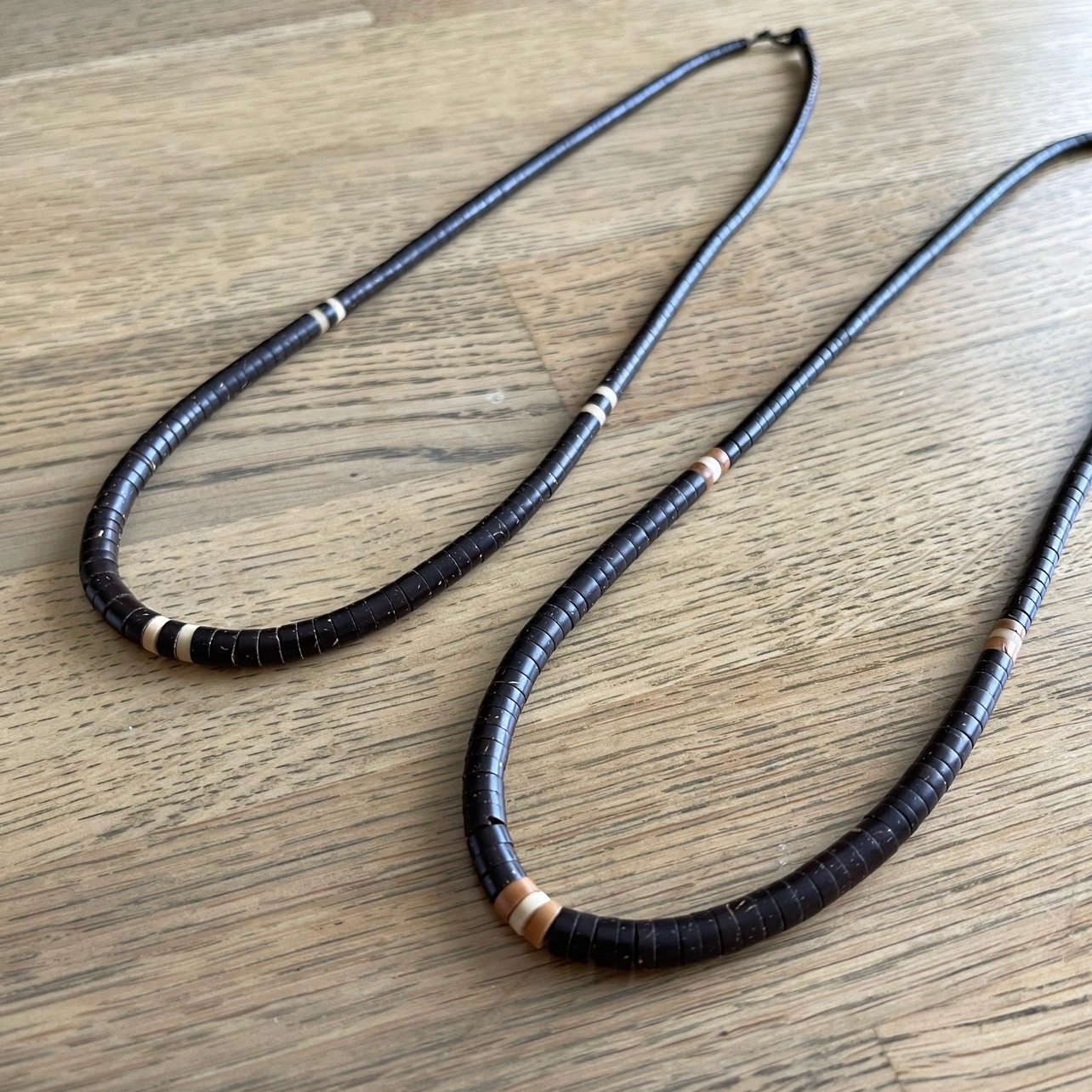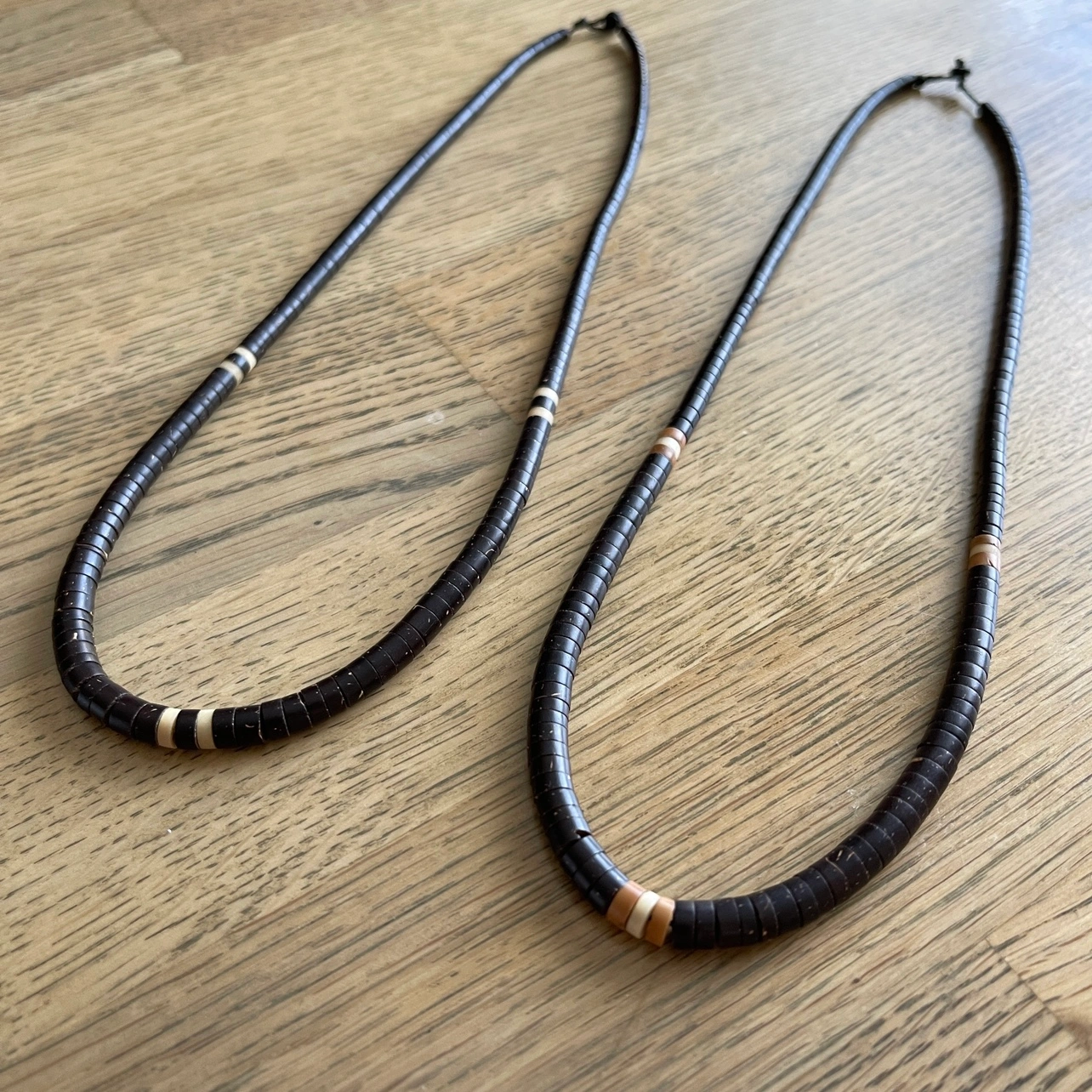 A truly piece of art. Handcrafted necklaces by natives of the Amazon (Brazil) made of coconut shell and measuring 20” long. I have two available.