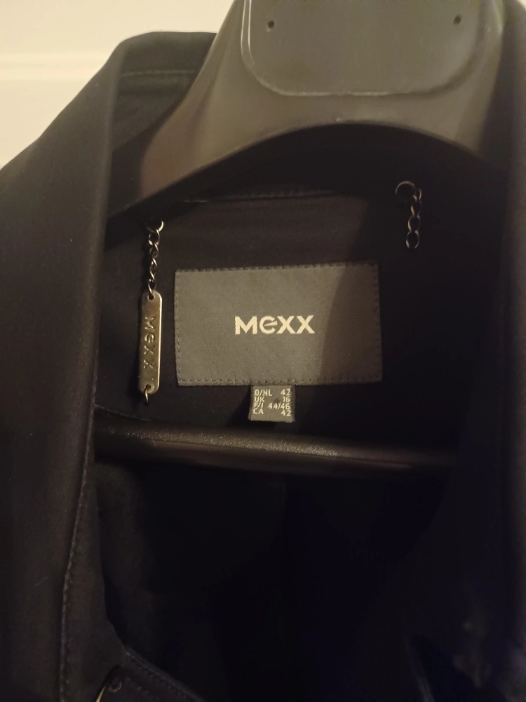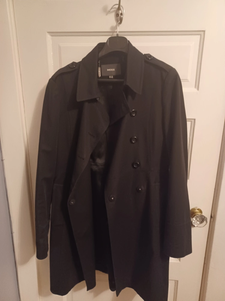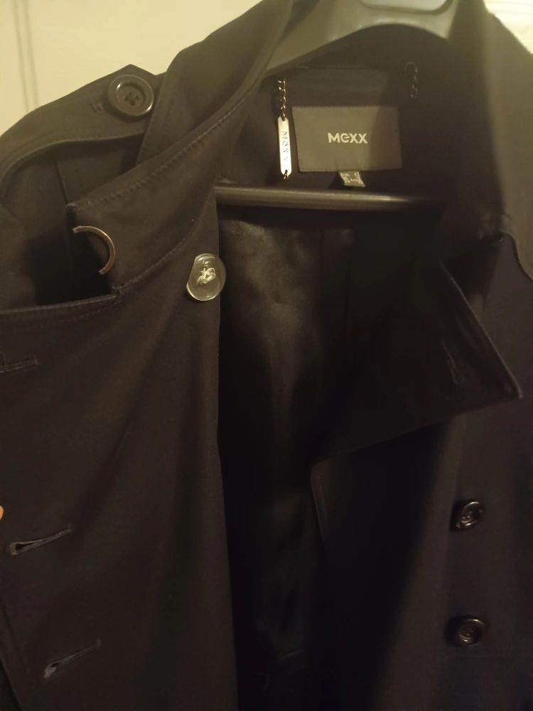 Black Mexx trenchcoat with buttong closures and sleeve detailing. Smooth interior lining and medium weight fabric. Broken chain detail on tag is the only issue.
