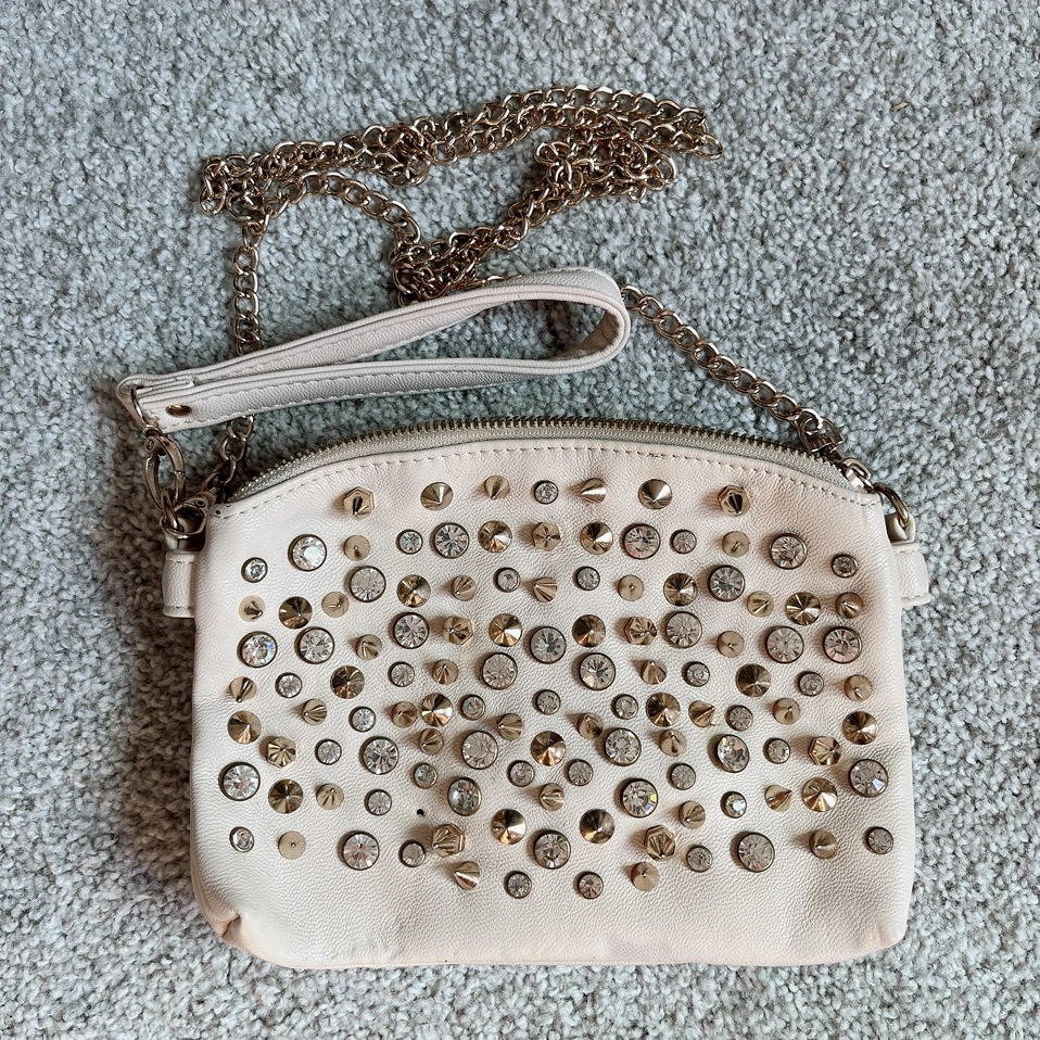 1038.5” W x 6.25” H Removable crossbody chain strap Missing 1 rhinestone (please see photo) Pick up in rockland park nw