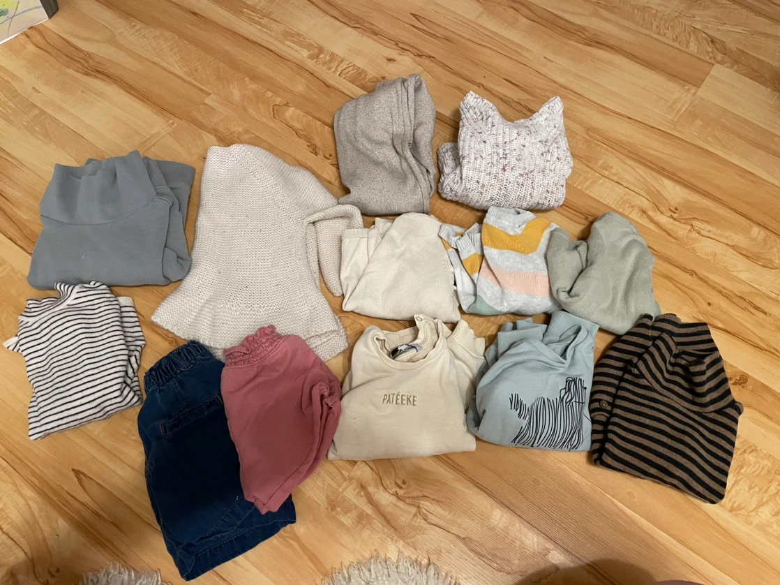Girls variety pack of 18 month to 24 month clothes mostly sweatshirts two pairs of shorts and a warm onesie. Zara, H&M, the gap A few European brands.