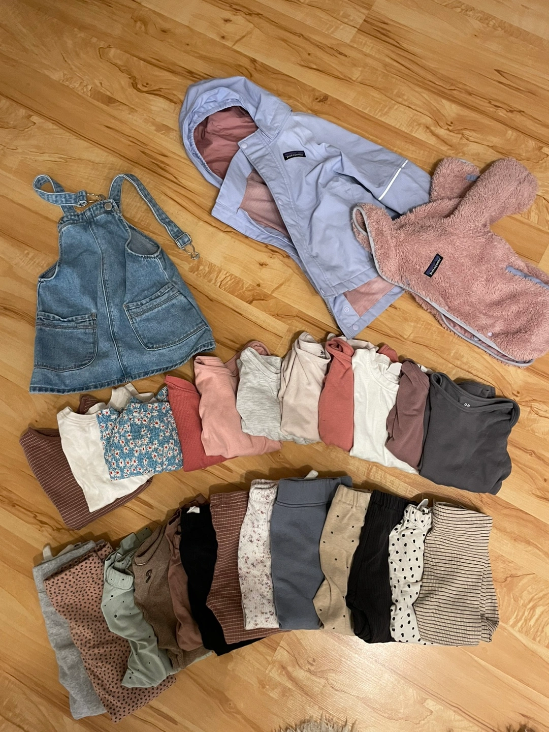 Patagonia brand jacket with a removable lining And a waterproof shell. Zara overall denim skirt. A variety of leggings and long sleeve shirts, Zara, H&M