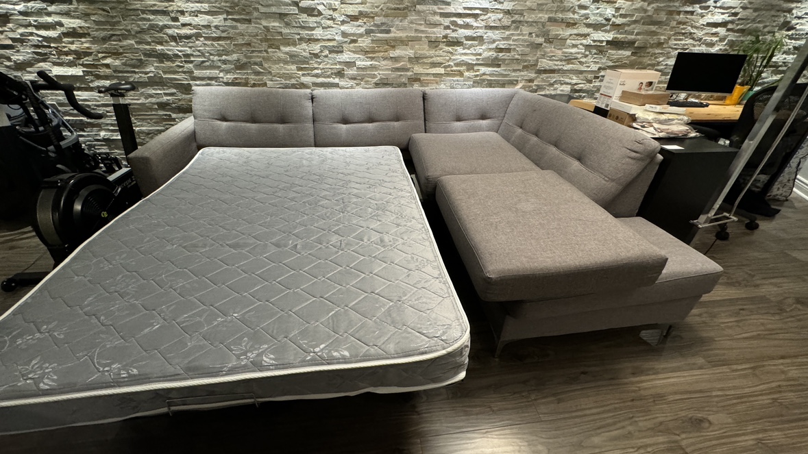 Excellent condition grey 4-piece sectional that also easily pulls out as a double bed
