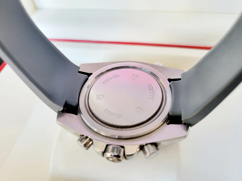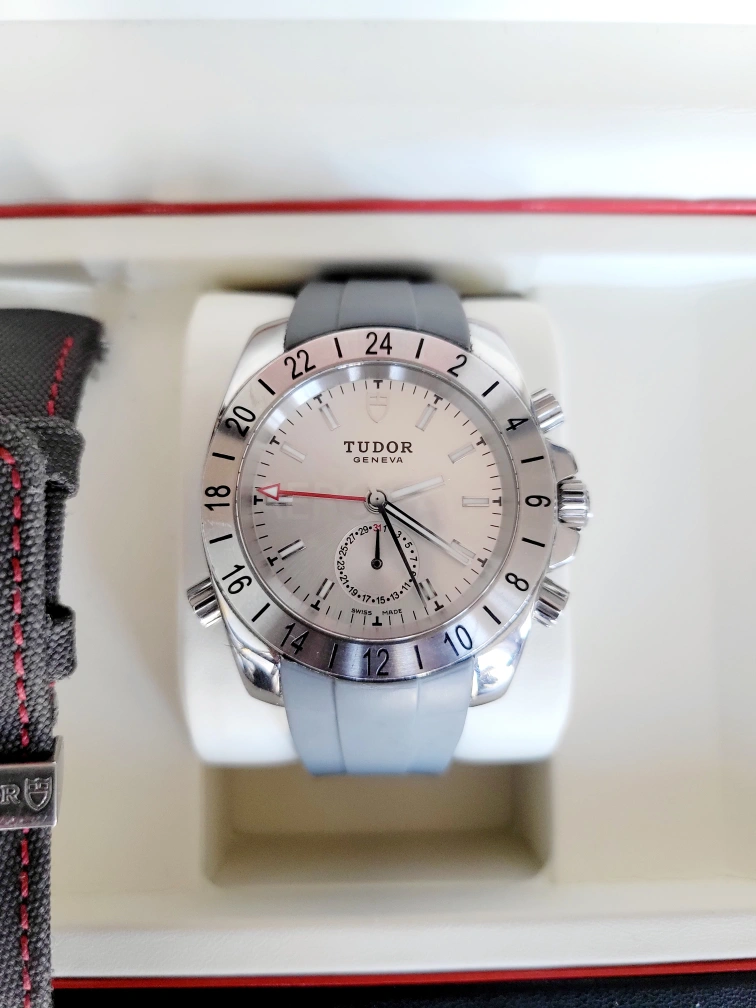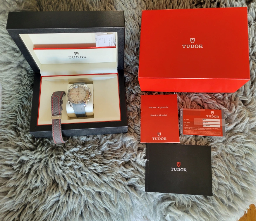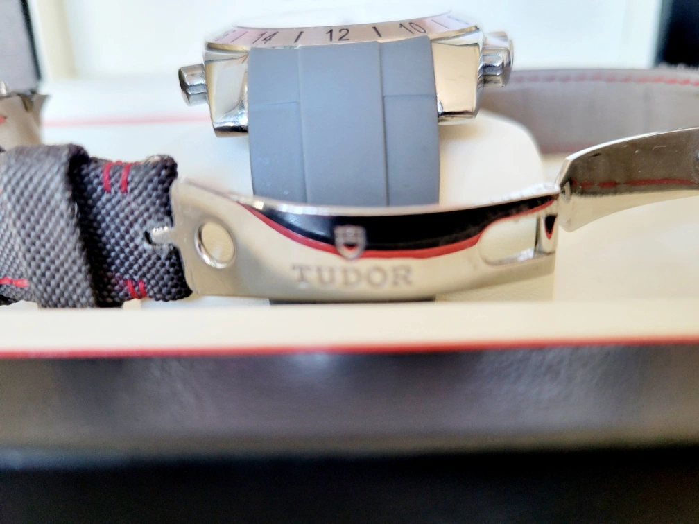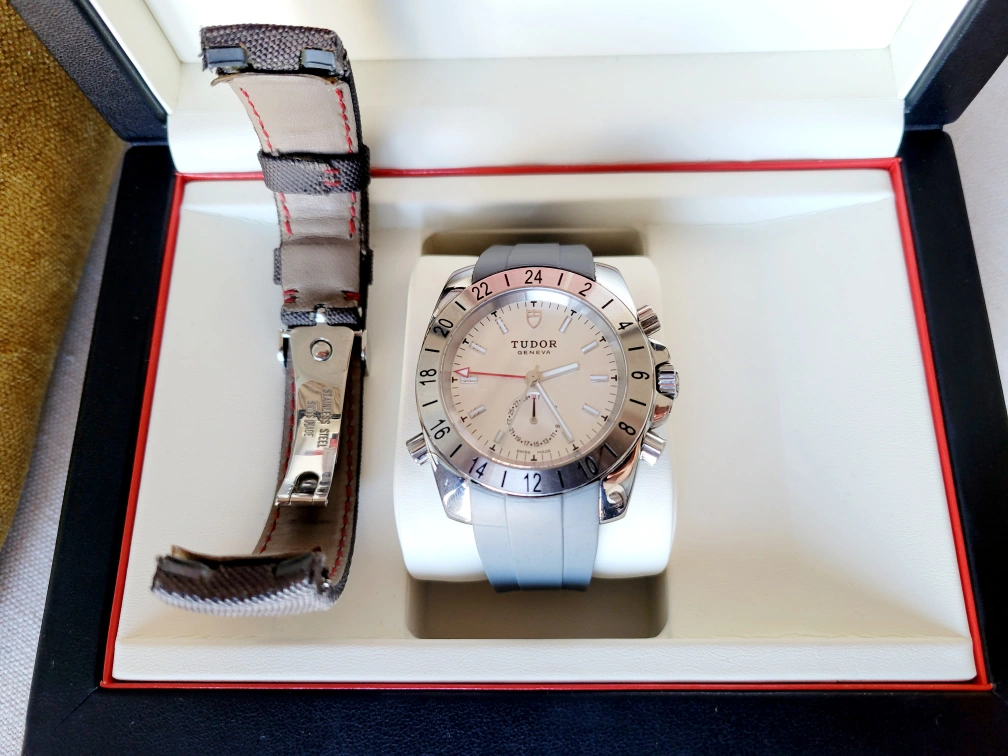 The original Tudor brown textile strap with the red stitching is included - the grey rubber strap in the photos is not an original but could be included as well.