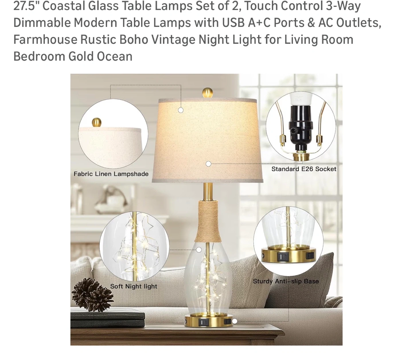 These 27.5" lamps feature a rustic boho vintage design with a linen lampshade. They include built-in USB A+C ports and AC outlets for convenient charging. The lamps have a touch control 3-way dimmable function and a soft night light feature within the glass base.