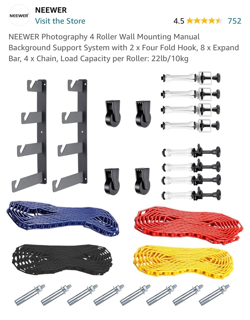 35Neewer brand from Amazon. Originally paid $130. Can hold 4 paper back drops at one time. Perfect for a home or professional studio. All original pieces are included and only half are opened.