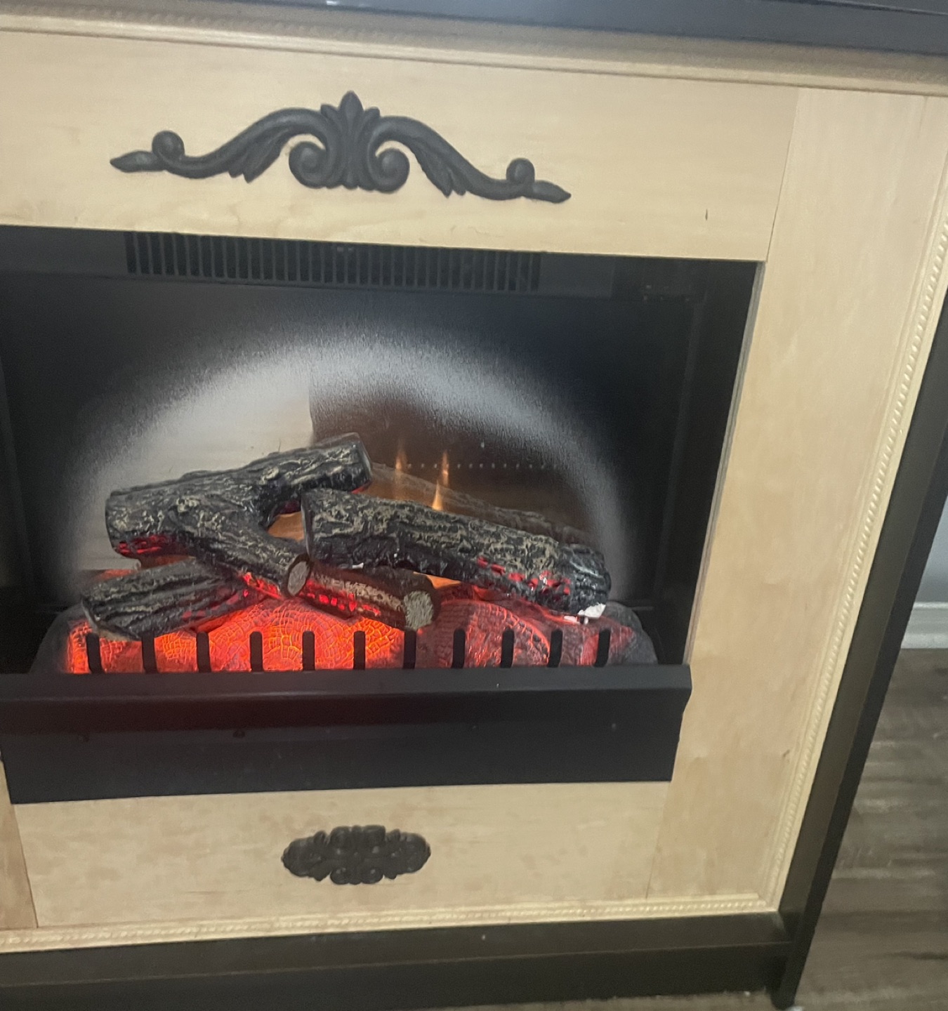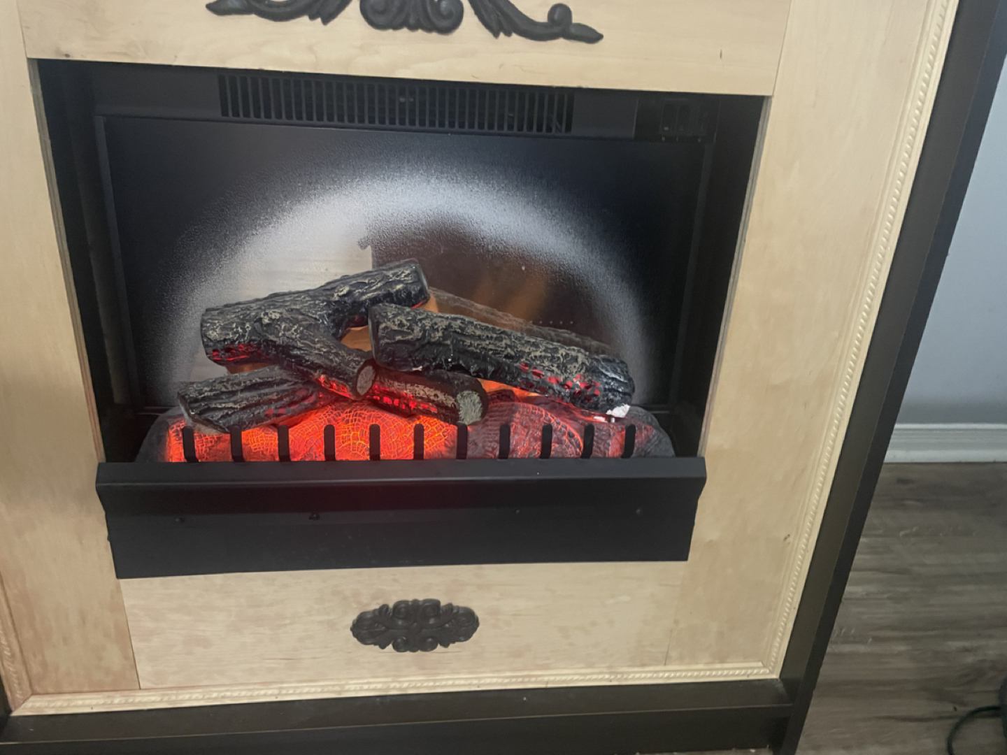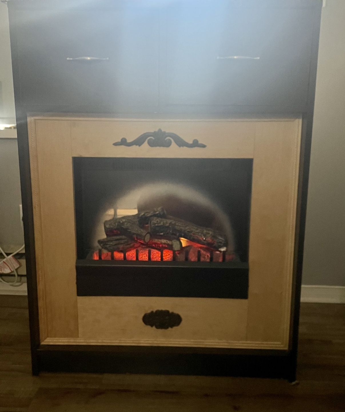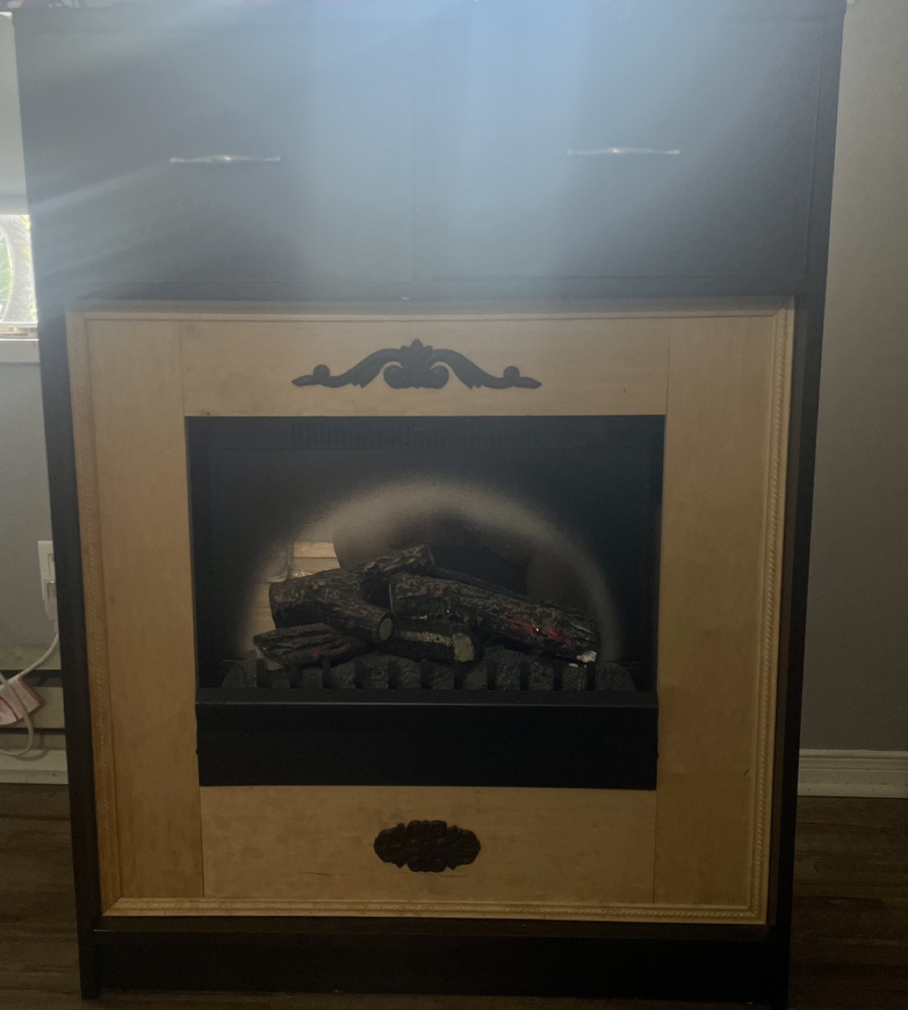 Brown electric fire place stand with two drawers for storage . Provides a good amount of heat in the winter and a beautiful fire image. Not real fire . #freecycle
