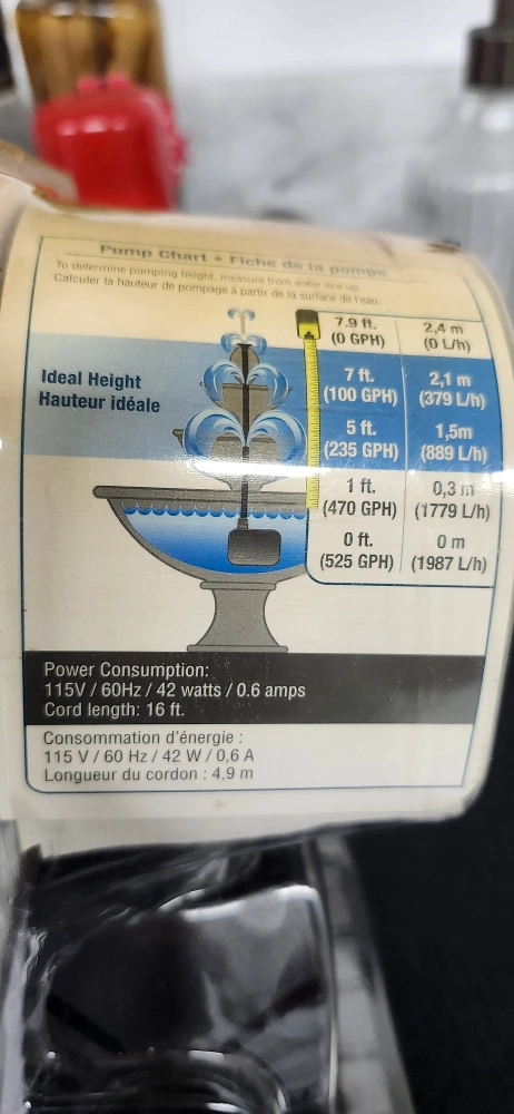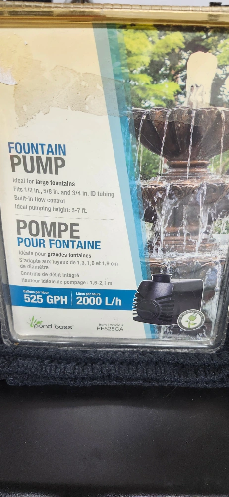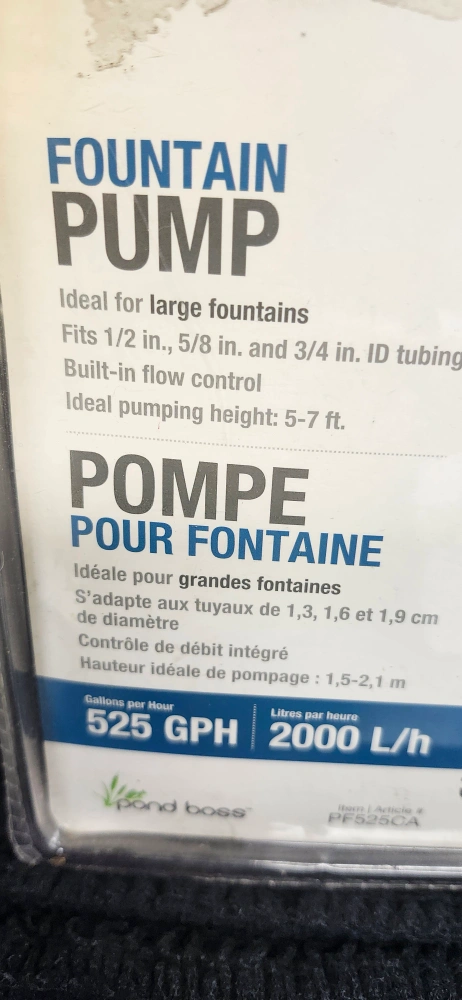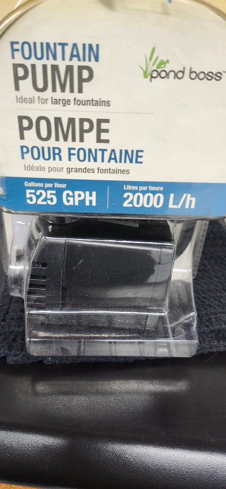 NEW Fountain Pump 525 GPH Ideal for Large Fountain Ideal pumping Height 5 - 7 ft. Built-in Flow Control FYI package has Never Been Opened More info on POND BOSS website