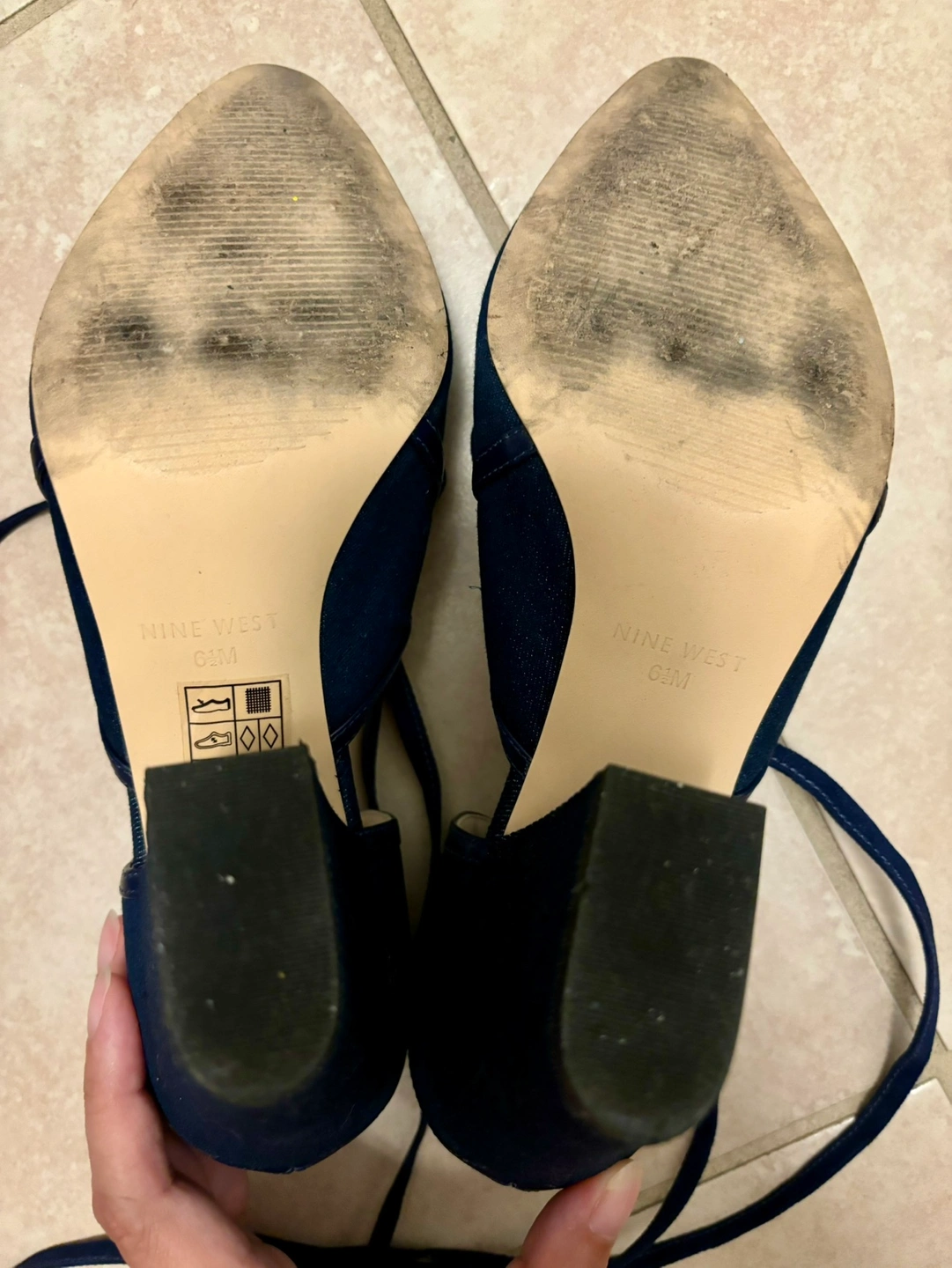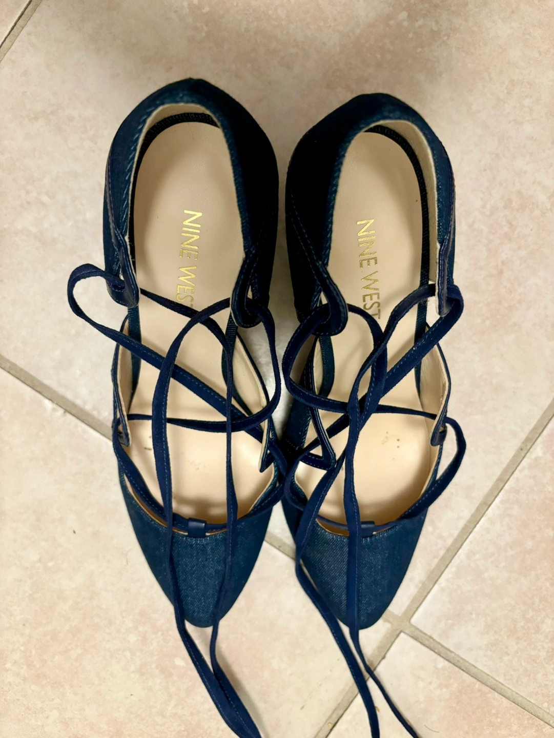 125Denim blue heels from Nine West. Comfortable in walking. Lightly used. Never go out of style like the blue jeans. The long lace can be tide to the front or back or to create your own style. 8.5cm heels. Feel free to contact for product details.
