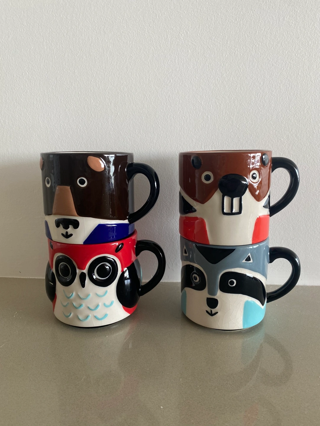 Set of four cute animal mugs looking for their second life! Well-loved but in overall good condition.