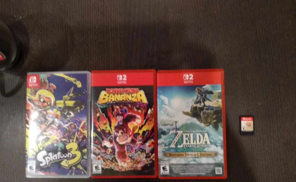 4 Nintendo Switch games: Splatoon 3 (small damage on plastic around case), Donkey Kong Bananza, and The Legend of Zelda: Tears of the Kingdom Switch 2 Edition, Super Mario 3d All Stars (only cartridge)