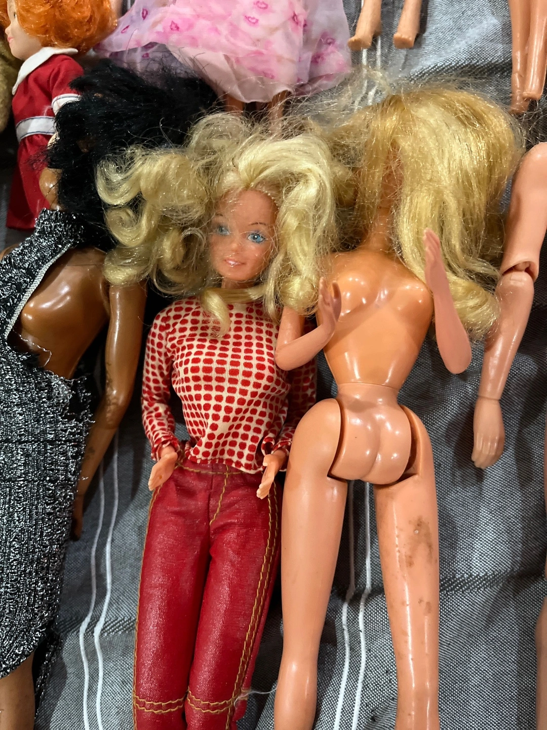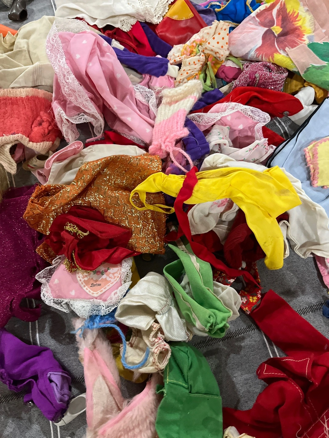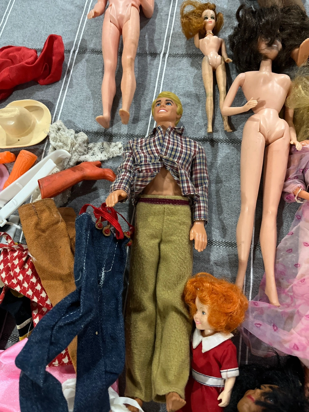 45Very good deal here. Just dozens of Barbie clothes, dolls, accessories. Vintage from the 1970s, with some from the 1960s and 1980s. There’s also a scarecrow mego doll from wizard of Oz. An Annie doll. Some Ken dolls too.