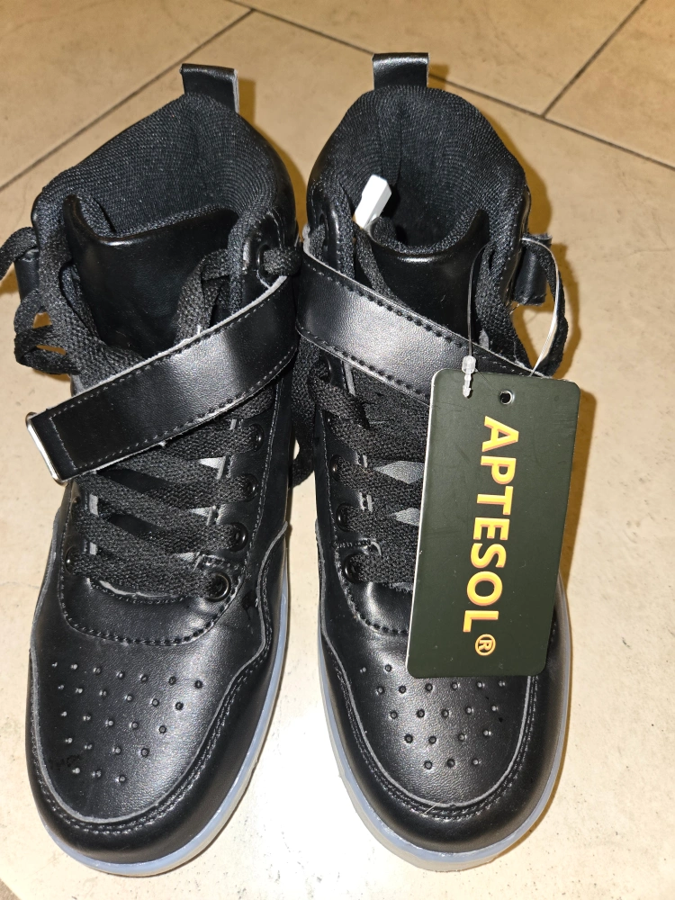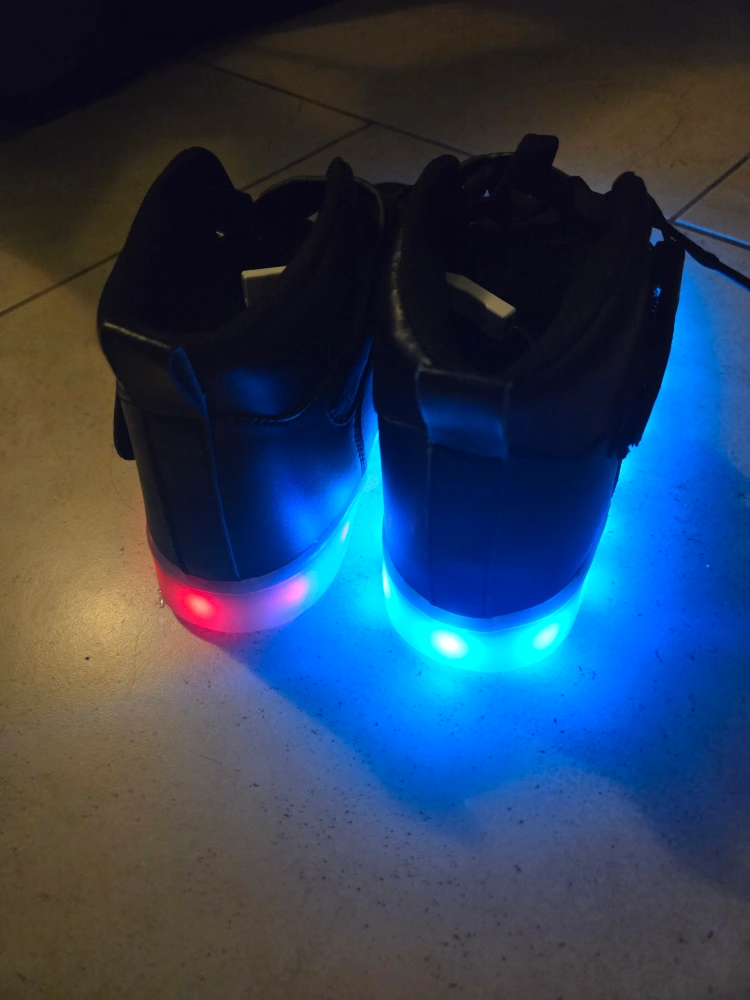 Brand New rechargeable LED High Tops that light up when you turn them on. You can change the light color to blue, red, white, green, yellow and change them to flashing patterns or solid! New condition with tag still on -- I tried them on indoors, but while they are super fun, I don't see using them enough to make it worth keeping them. Size 36. asking $60 OBO