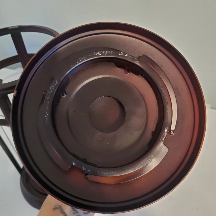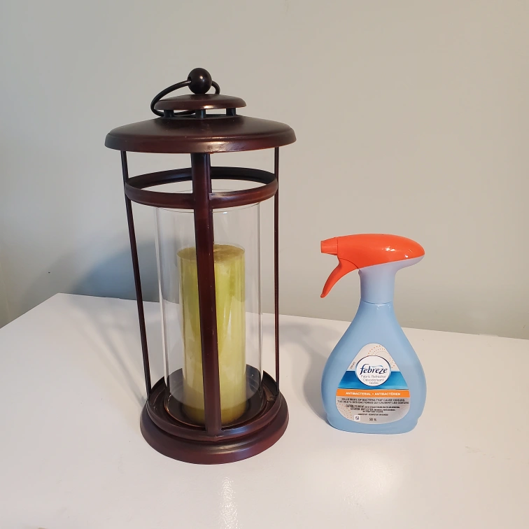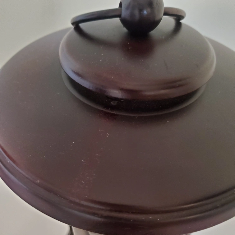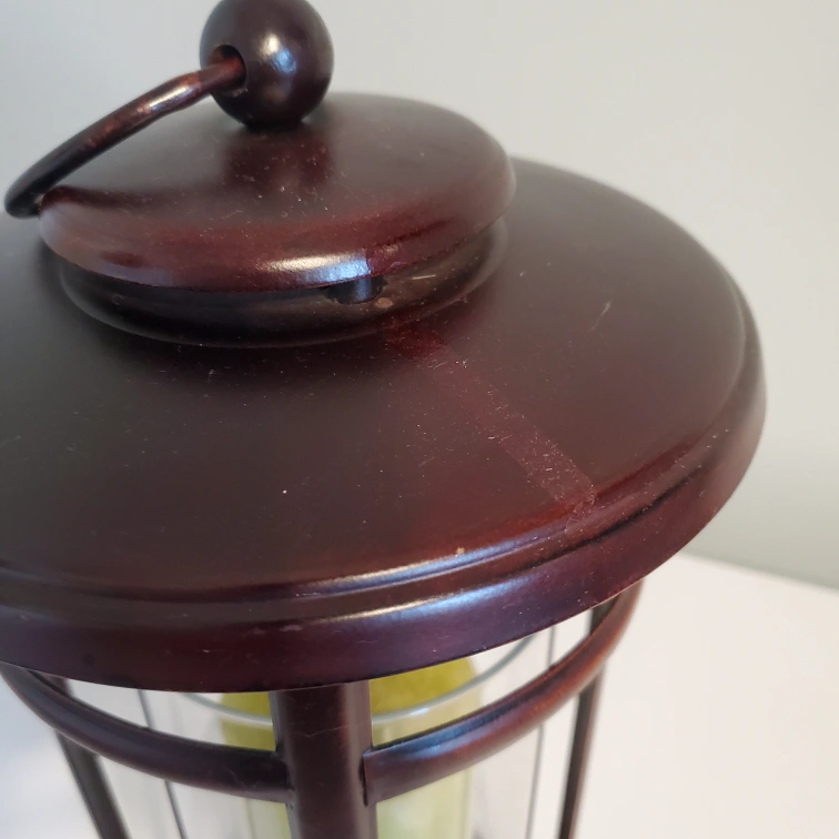 sits roughly 16 inches tall. Top comes off and twists on for stable carry. Holder is sturdy with glass piece inside that covers the candle. In really good condition.