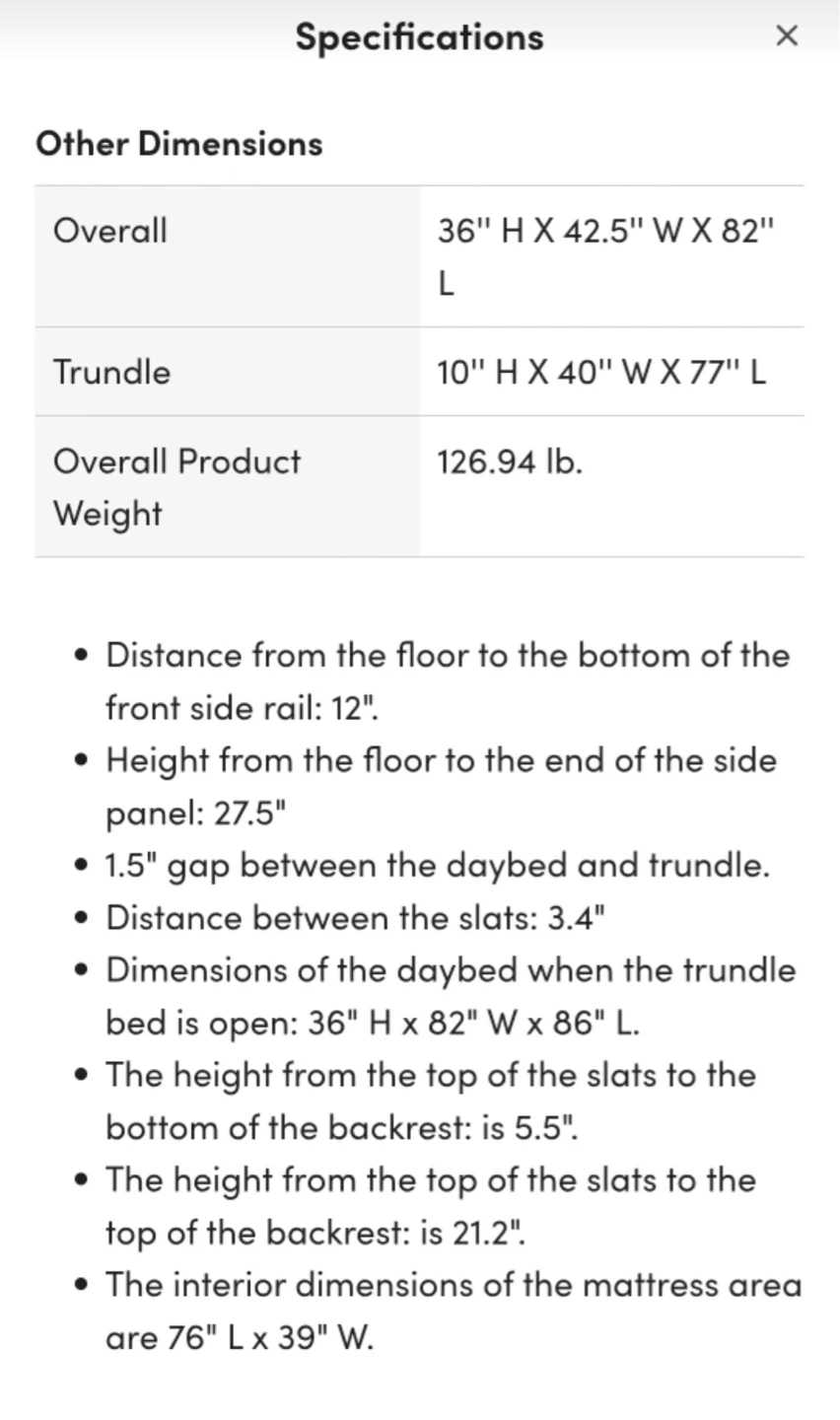 Overall dimensions are 82" L x 42.5" W x 36" H. Trundle dimensions are 77" L x 40" W x 10" H.