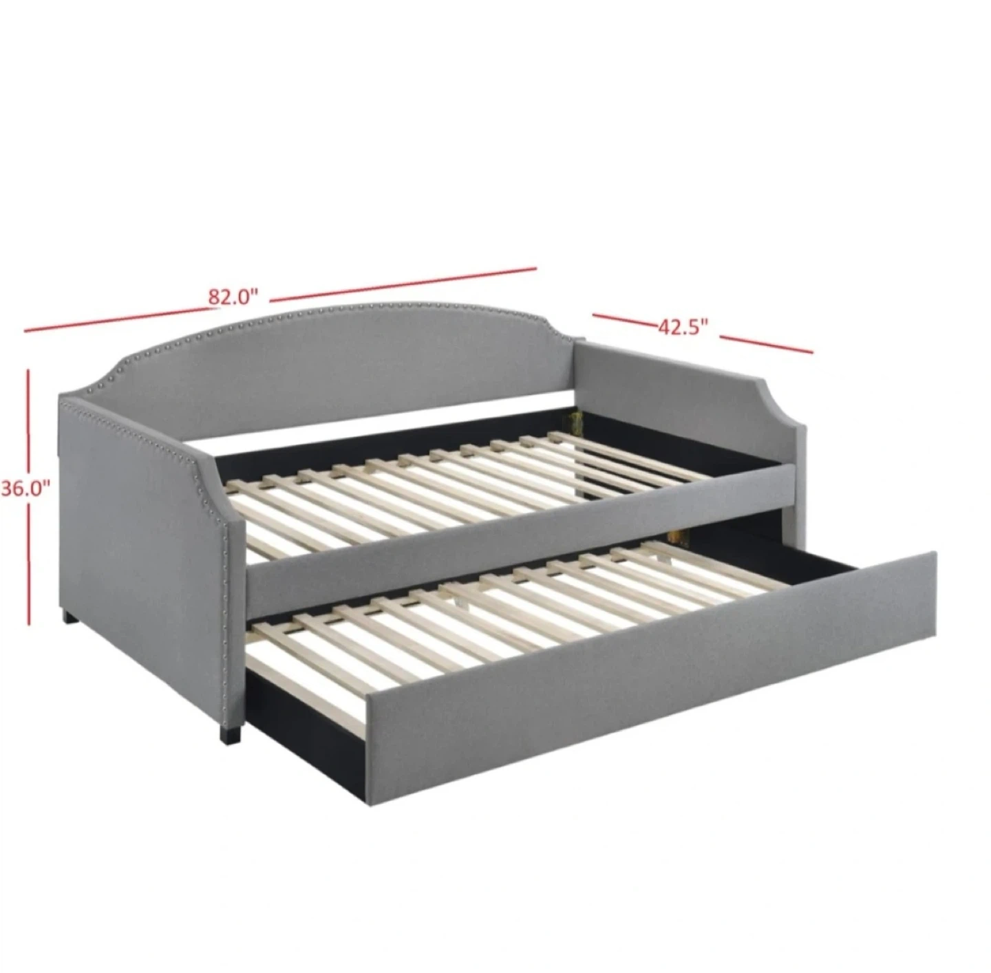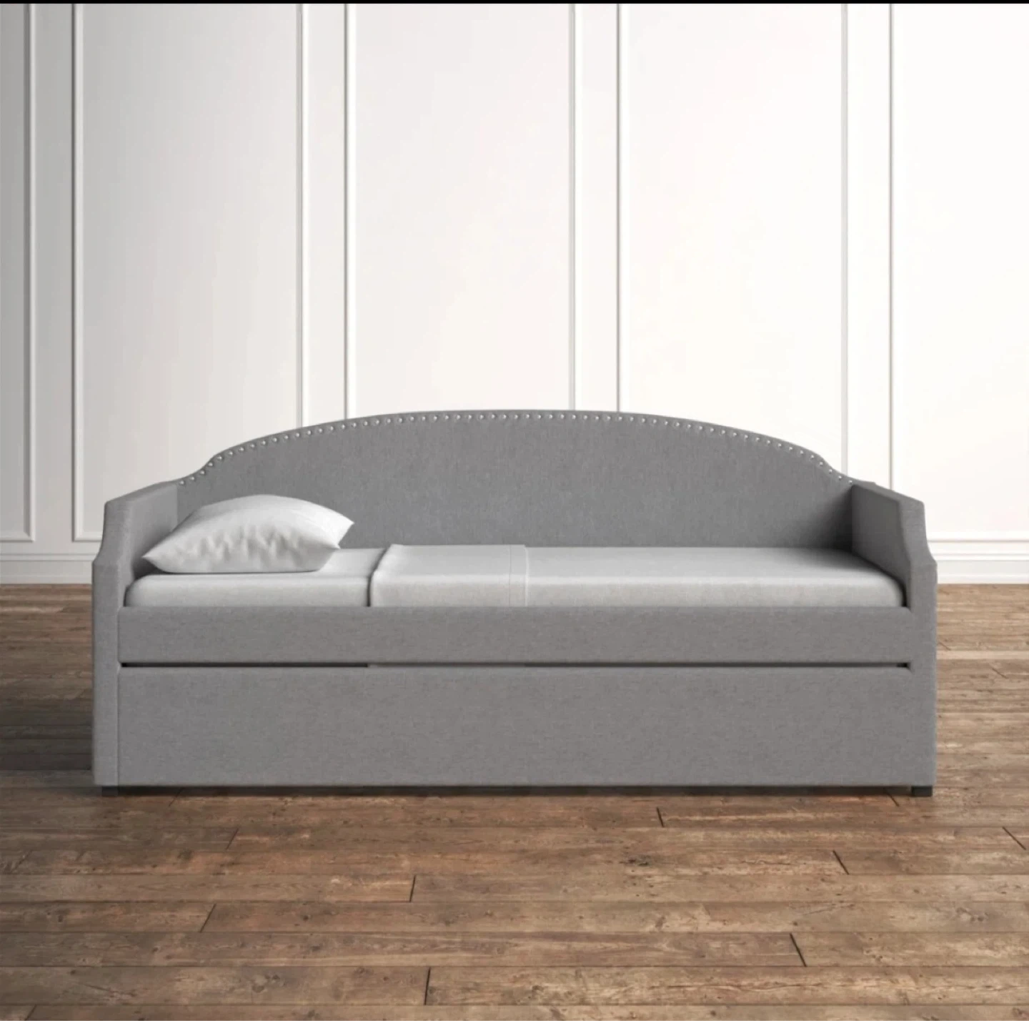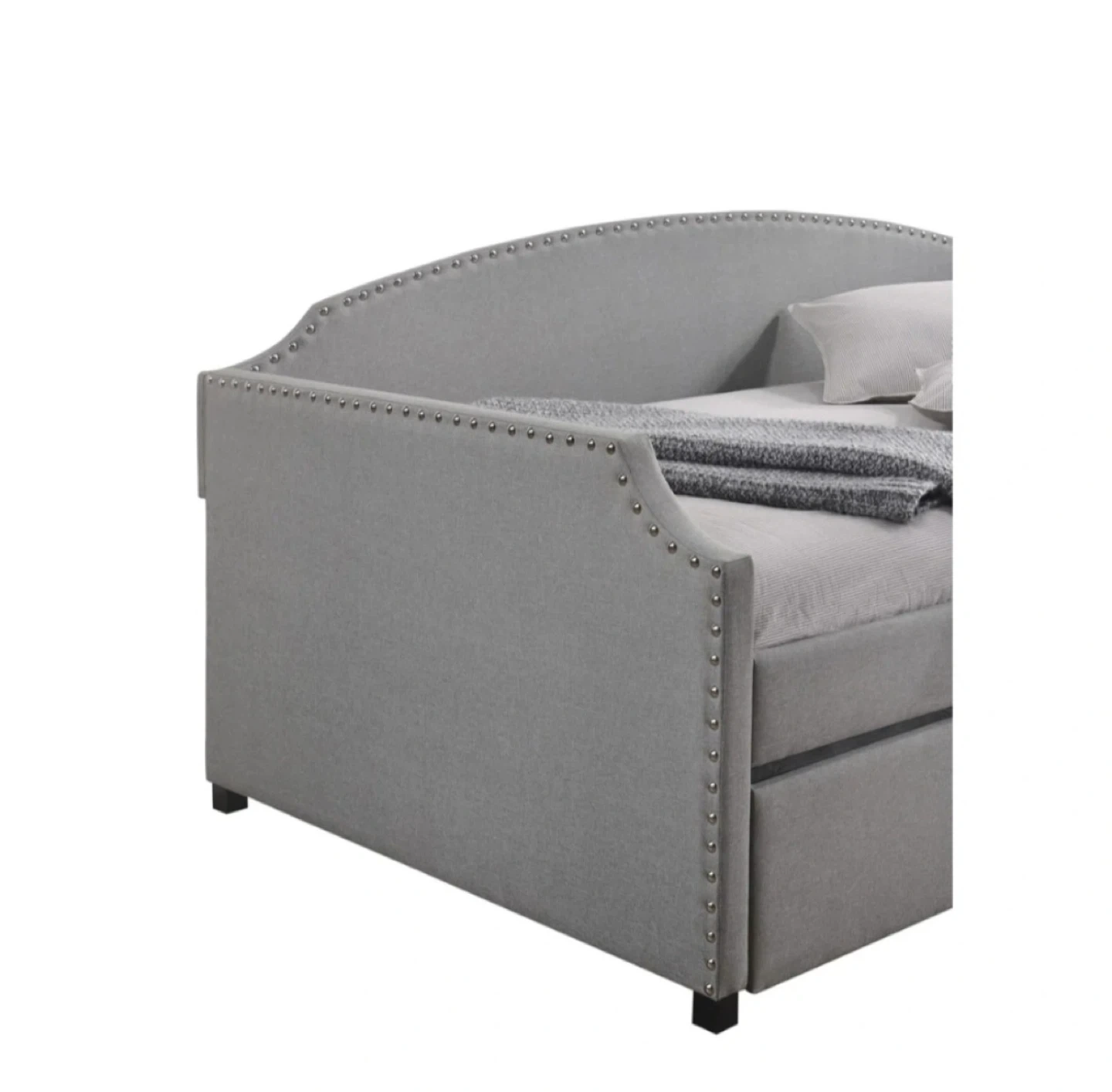 Grey upholstered daybed with a trundle underneath. Includes nailhead trim detailing.