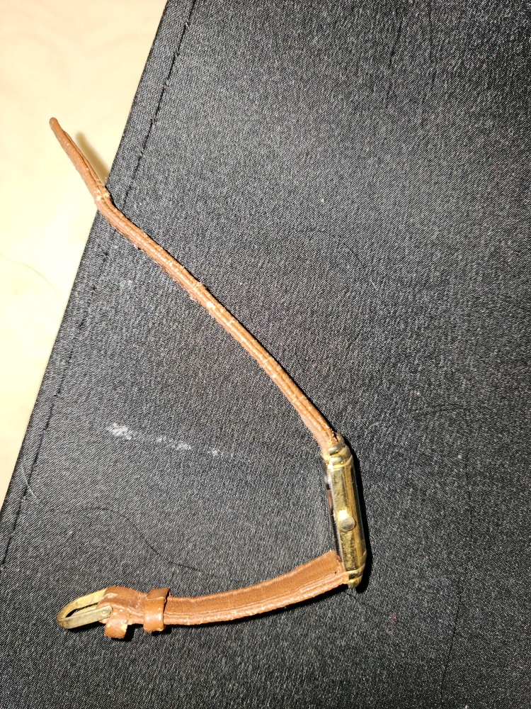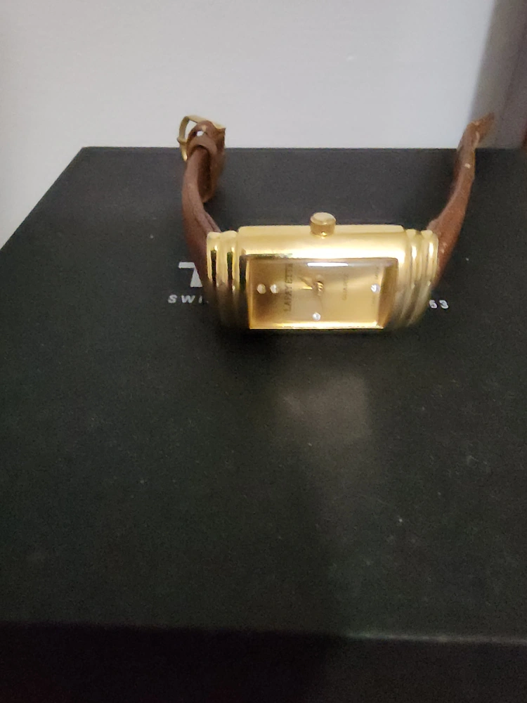 Selling a Lafayette women's watch with a gold-tone case and brown leather strap. The watch has a rectangular face with small decorative stones. The band shows some signs of wear.