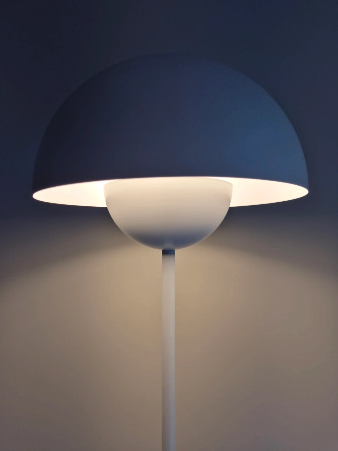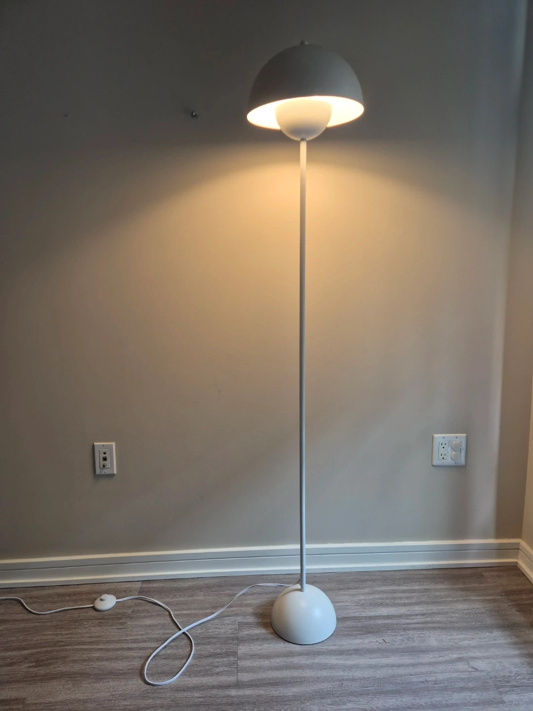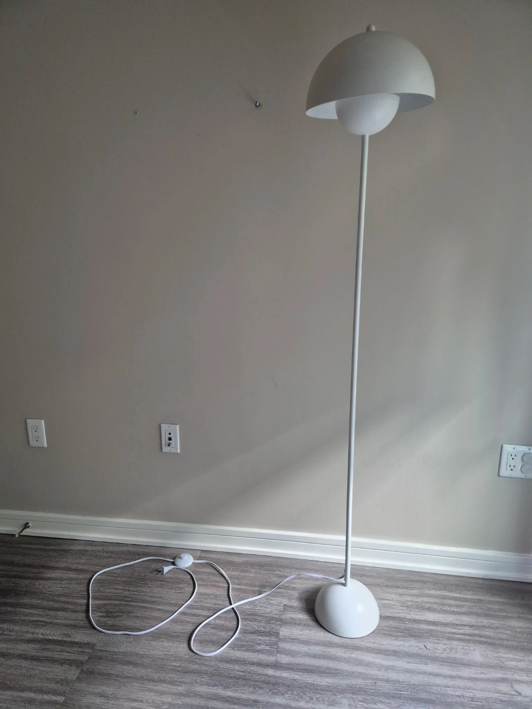This white arc floor lamp provides a stylish and functional lighting solution. It features a sturdy base and a dome-shaped shade. The lamp has a simple on/off switch on the cord. It's perfect for adding ambient light to your living room or reading nook.