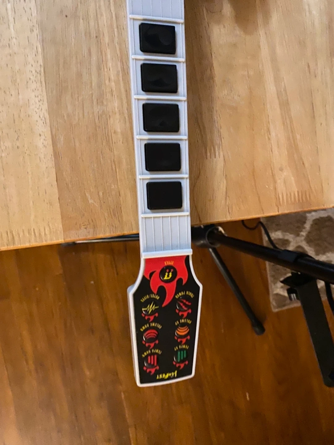 This is a Jamfest brand toy guitar with a built-in keyboard. It features multiple buttons and a strum bar for interactive play. The design is black with orange and yellow flames.