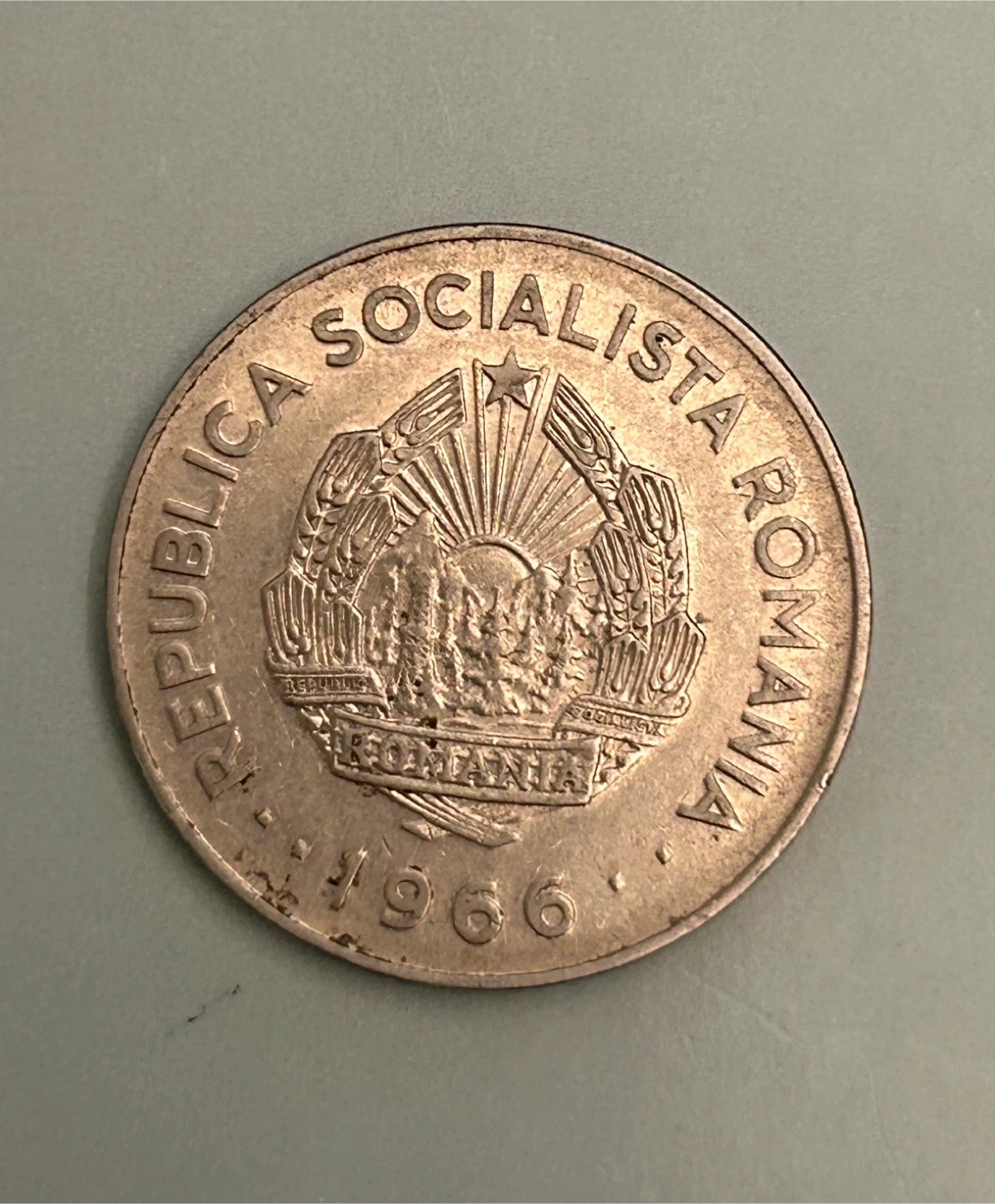 This is a 1 leu coin from the Socialist Republic of Romania, dated 1966. It features a tractor plowing a field on one side and the national emblem on the other. A neat piece of numismatic history!
