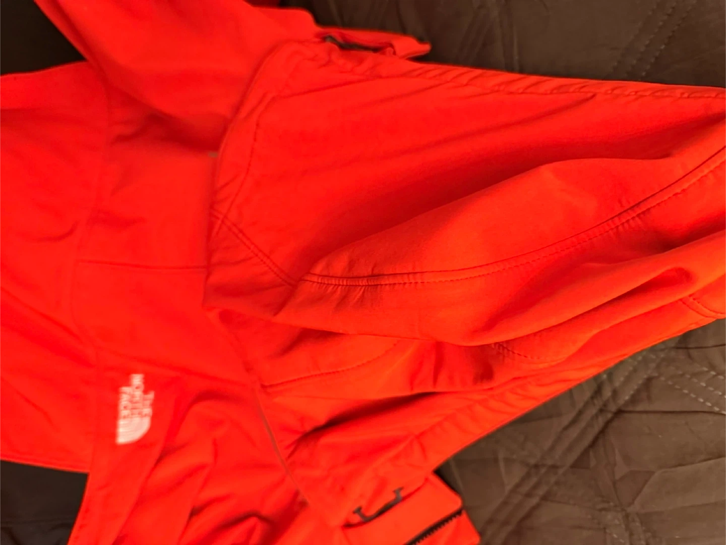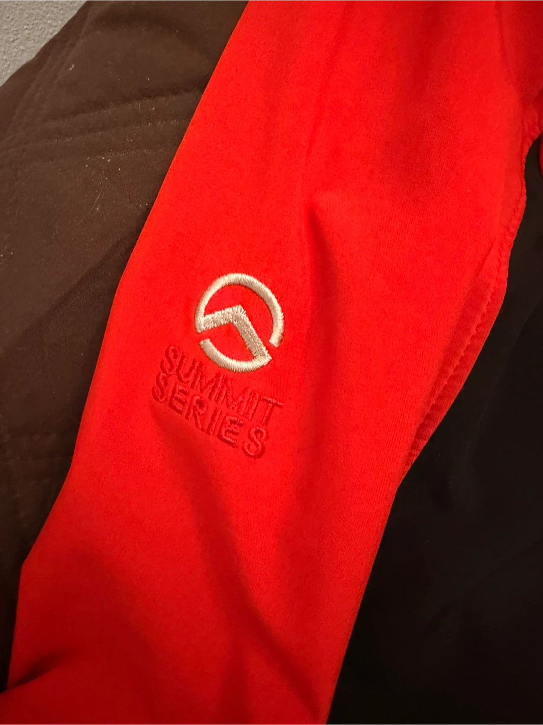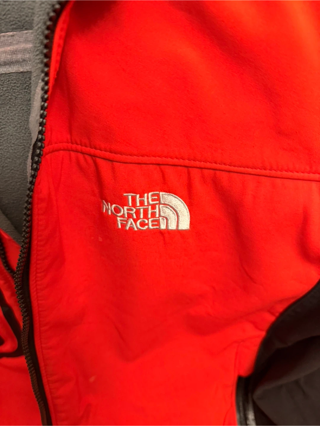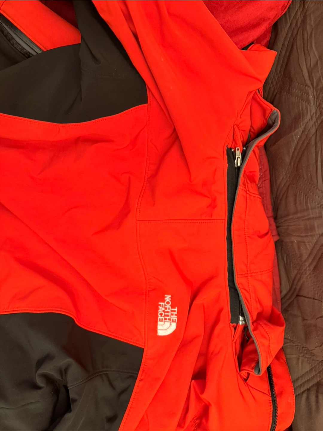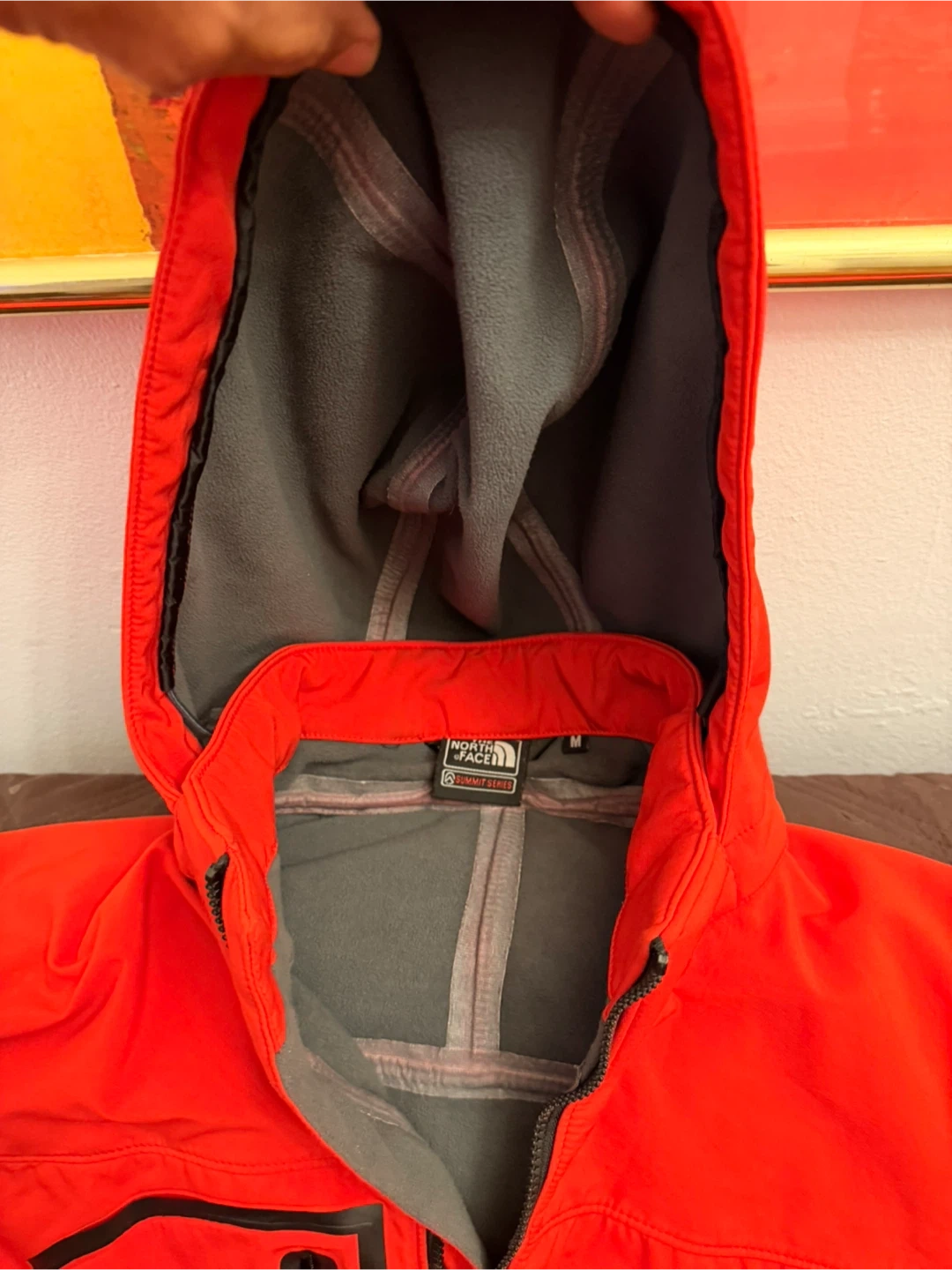 This is The North Face Summit Series jacket. It's made with Gore-Tex for waterproof and breathable protection. It features a bright red exterior with black accents. Several zippered pockets are included for secure storage. This jacket is built for outdoor adventures!