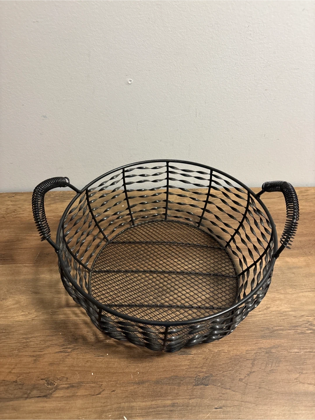 This is a round wire basket with a mesh bottom and two decorative handles. It's great for storing or displaying various items. Wire construction.