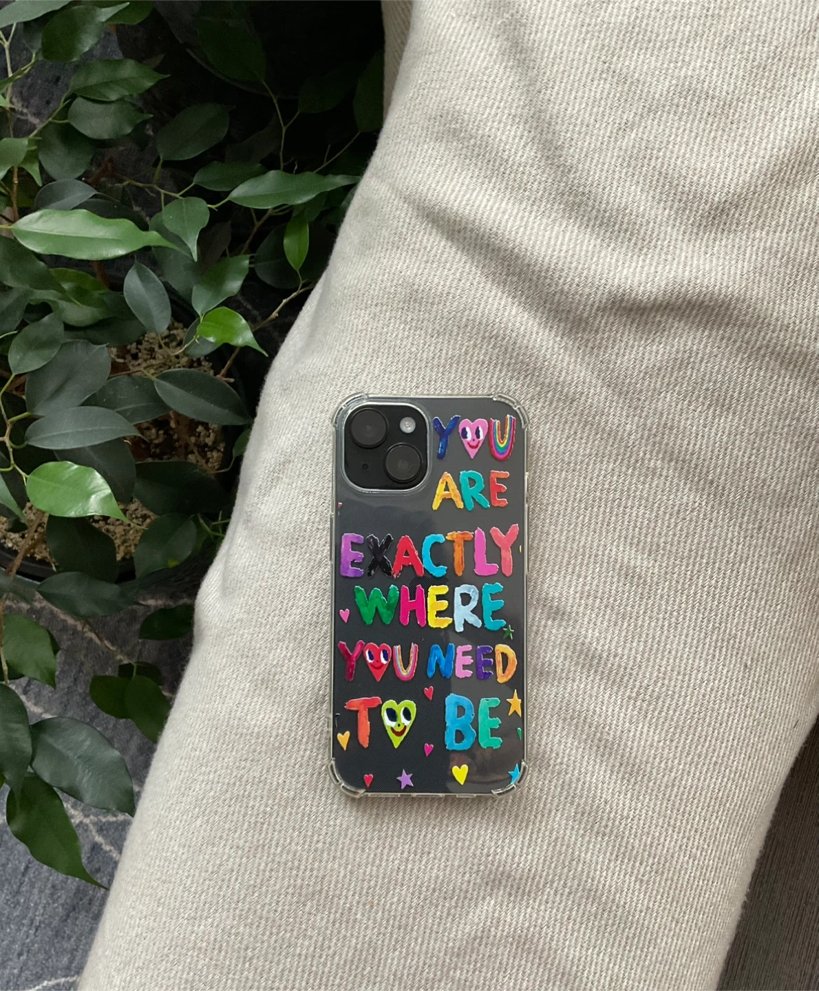 Clear phone case for iPhone 15 with a colourful quote "You Are Exactly Where You Need To Be". Offers protection and style for your device! Made in China.