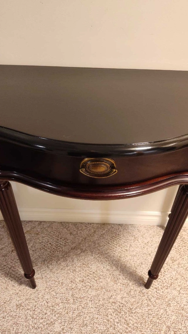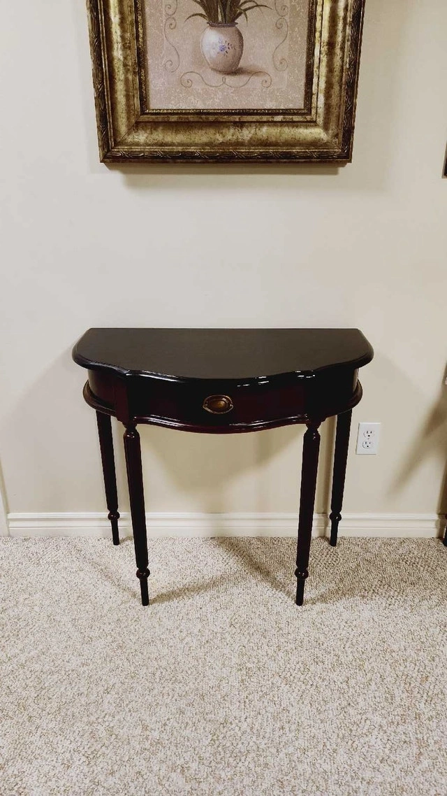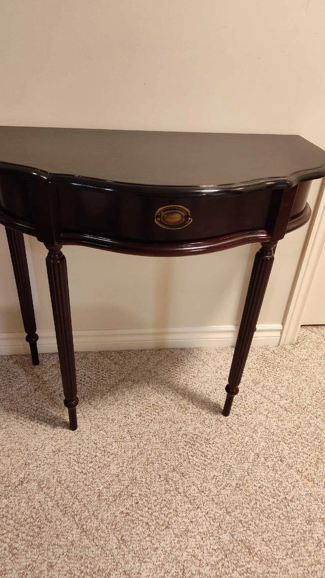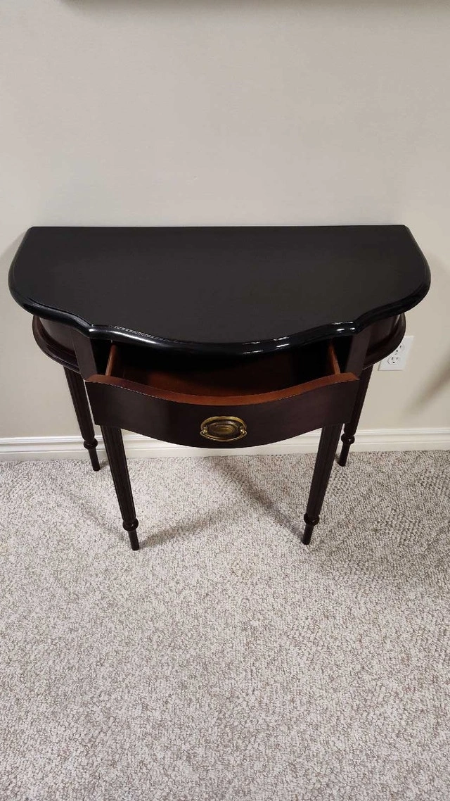This is a refinished hall table with a drawer. It has a mahogany finish with a refinished and top-coated black top. Features a single drawer with brass hardware, perfect for storing small items. The table's elegant design and compact size make it a versatile addition to any entryway, hallway, or living room. Approximate dimensions: Height: 30 inches, Width: 32 inches, Depth: 16 inches. Pick up in the Lisgar area of Mississauga.