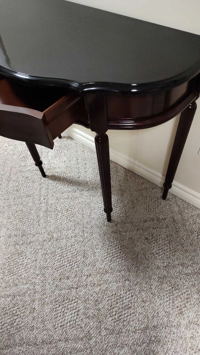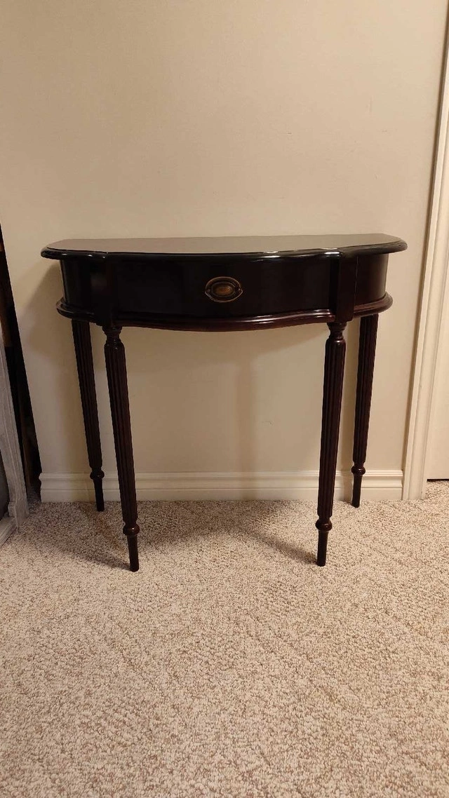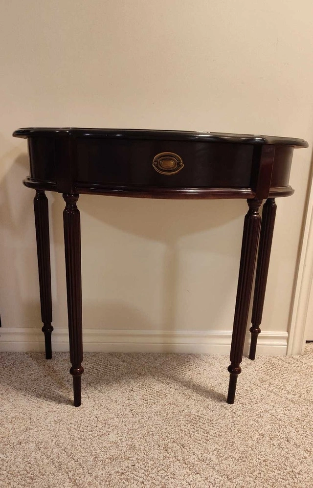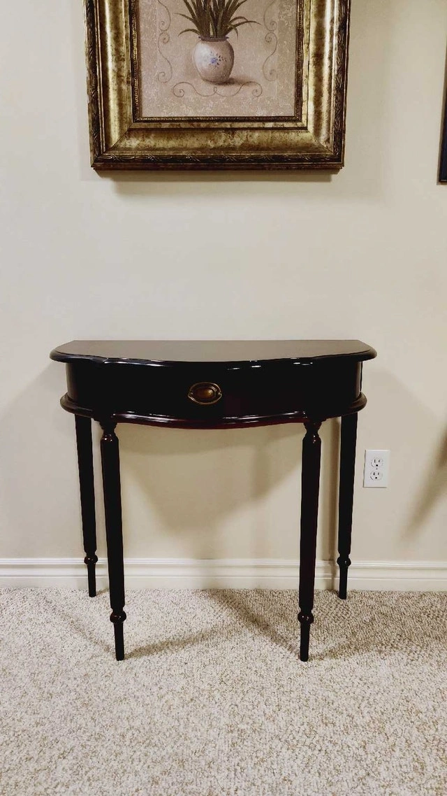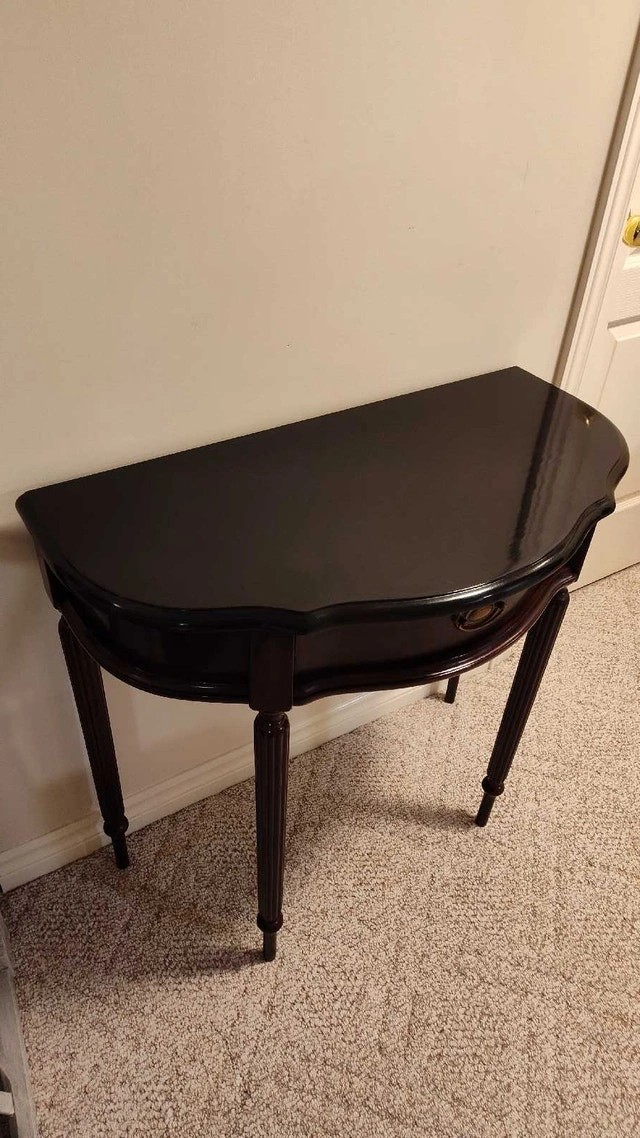 This is a refinished hall table with a drawer. It has a mahogany finish with a refinished and top-coated black top. Features a single drawer with brass hardware, perfect for storing small items. The table's elegant design and compact size make it a versatile addition to any entryway, hallway, or living room. Approximate dimensions: Height: 30 inches, Width: 32 inches, Depth: 16 inches. Pick up in the Lisgar area of Mississauga.