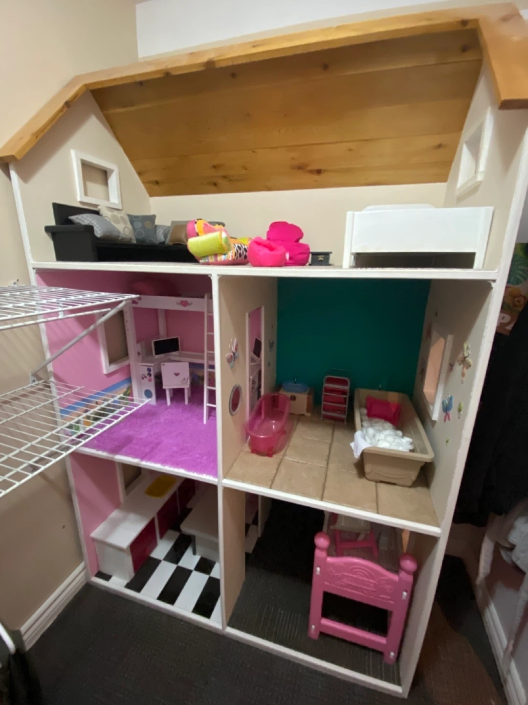 A multi-story dollhouse complete with various rooms and furniture. It includes a living room with a couch and cushions, a bedroom with a bed, a kitchen area with cabinets, and a bathroom with a tub. Great for imaginative play! Approximate size 4’ x 75”H. Solidly built.