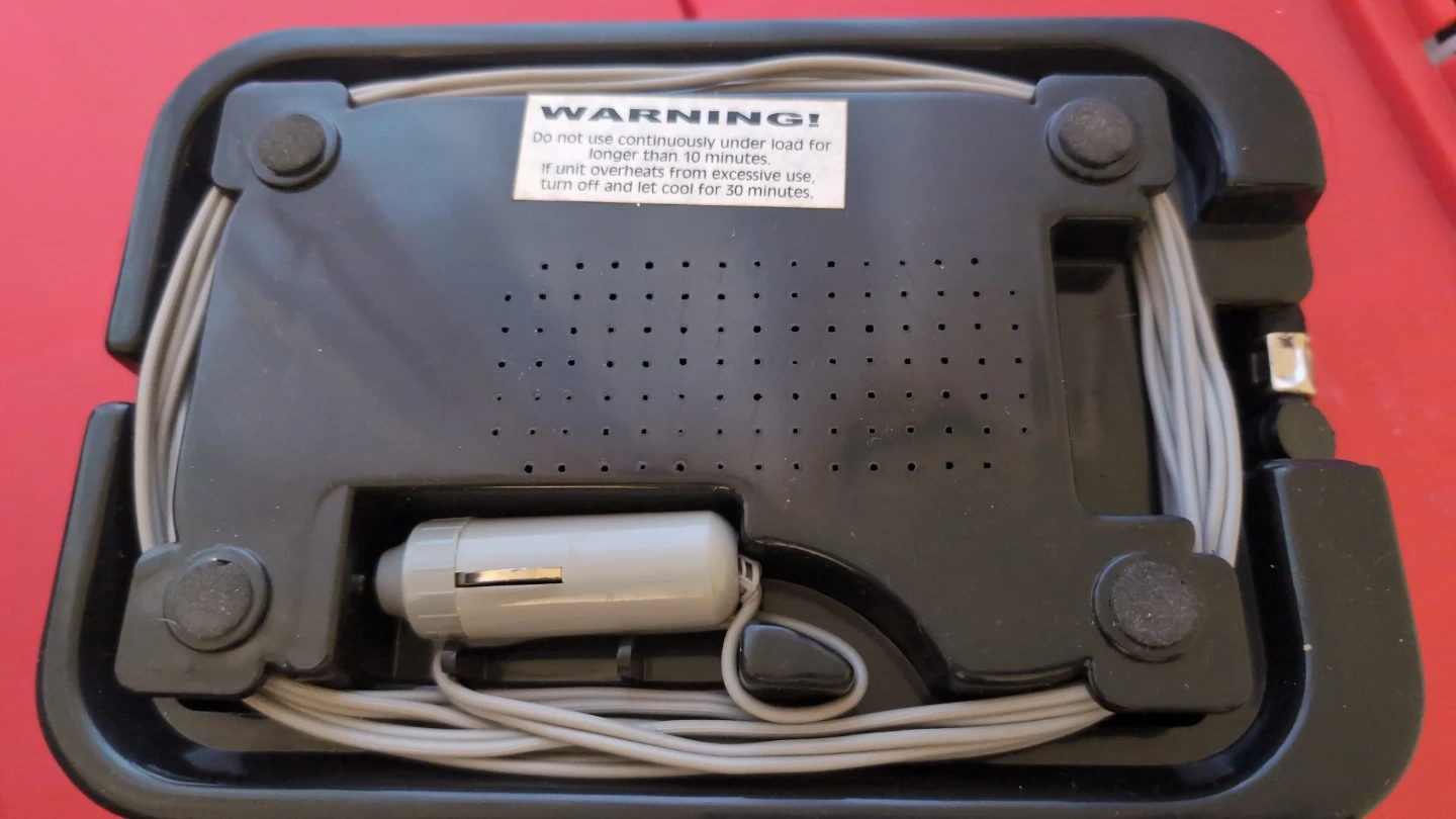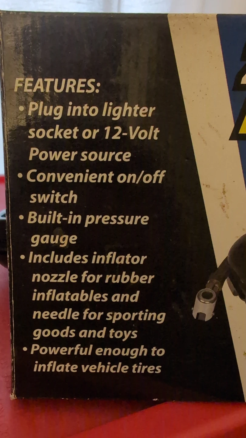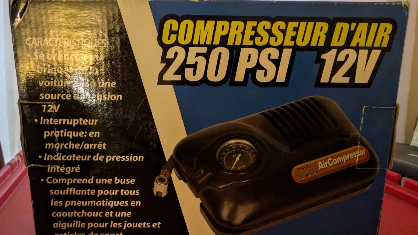 20Selling an air compressor, 250 PSI, 12V. It comes with an integrated pressure indicator and a nozzle for inflating tires and sports equipment. It also has a practical on/off switch