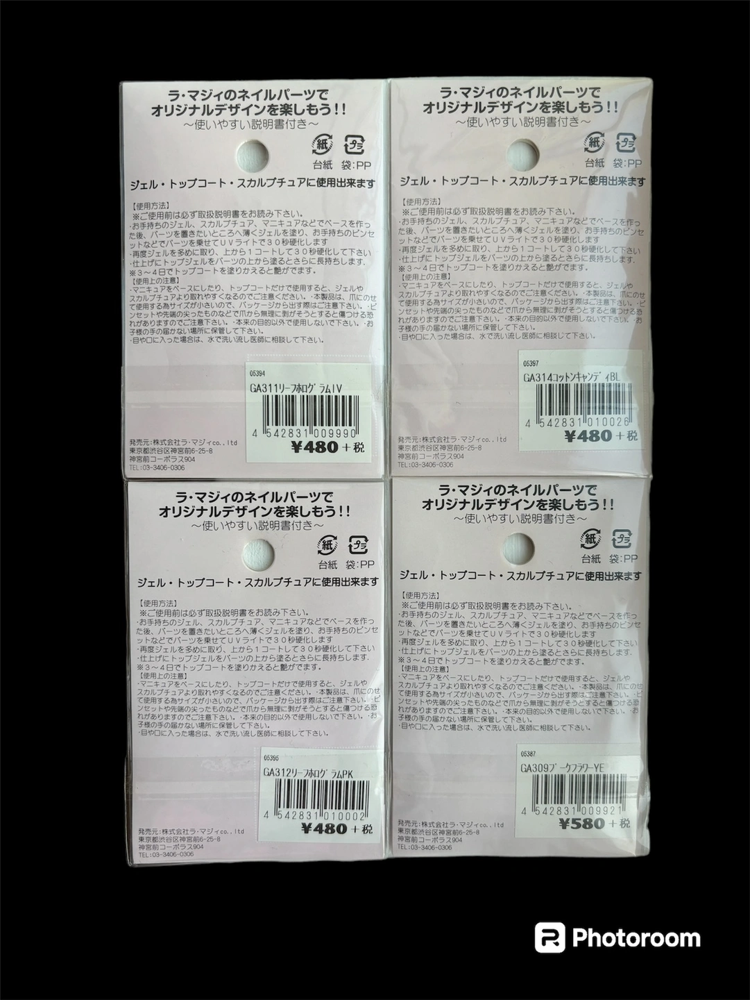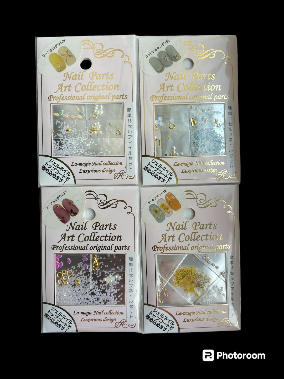 Professional original parts for nail arts. Made in Japan. Imported from Tokyo Japan as shown in the back. New unopened. With nails sample guide, easy to creat luxurious design at home. Brand new, never opened. The price is for all 4.