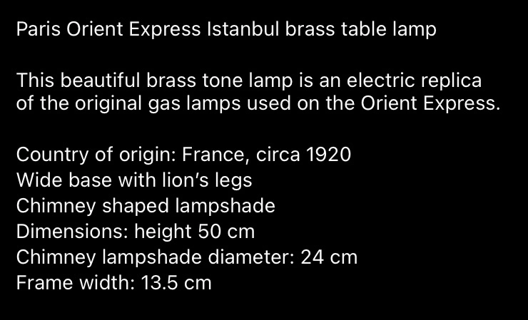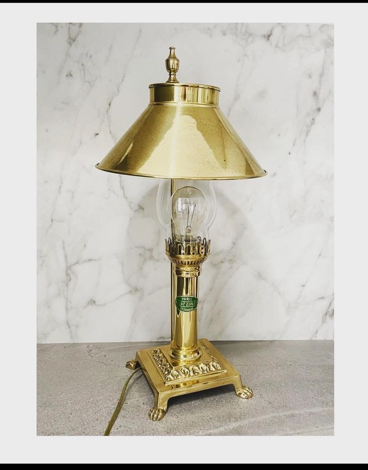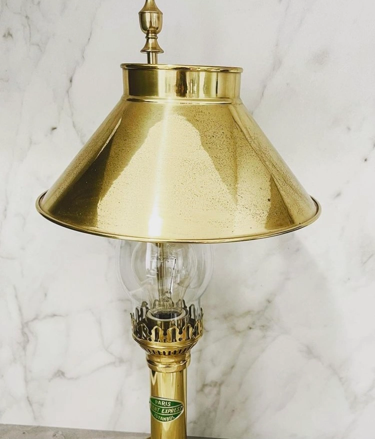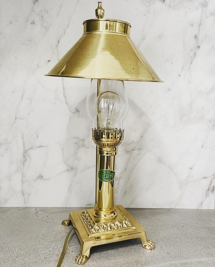 This beautiful brass tone lamp is an electric replica of the original gas lamps used on the Orient Express. This beautiful brass tone lamp is an electric replica of the original gas lamps used on the Orient Express. Country of origin: France, circa 1920 Wide base with lion's legs Chimney shaped lampshade Dimensions: height 50 cm Chimney lampshade diameter: 24 cm Frame width: 13.5 cm * some patina but can be polished- smoke free home Vintage Collectables Rare Vintage decor Vintage Lighting