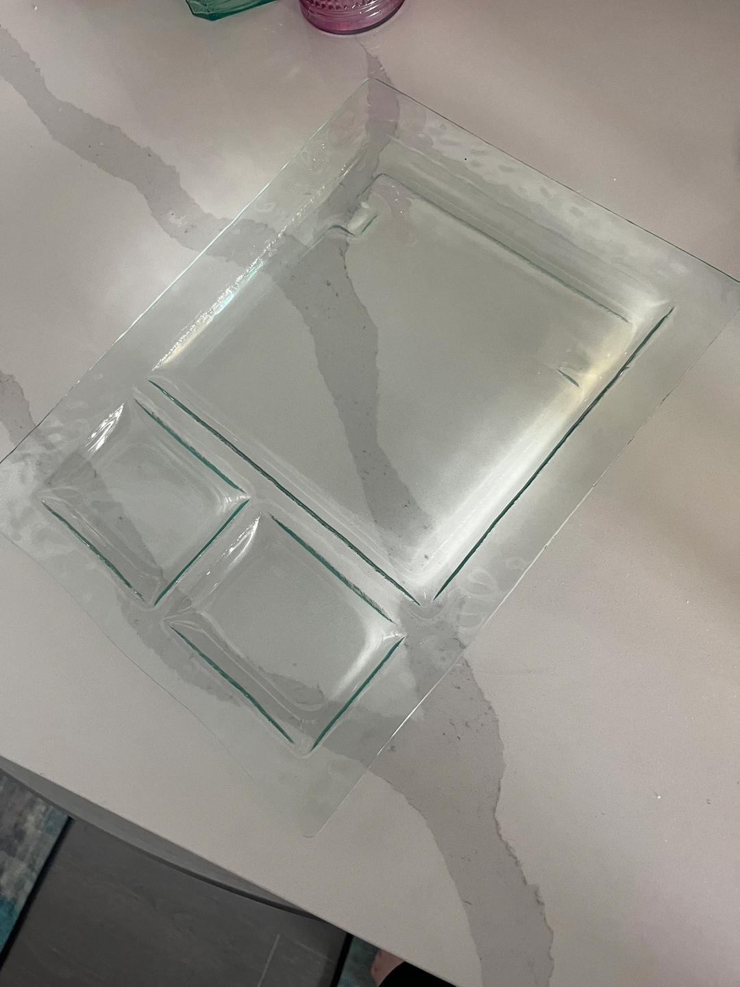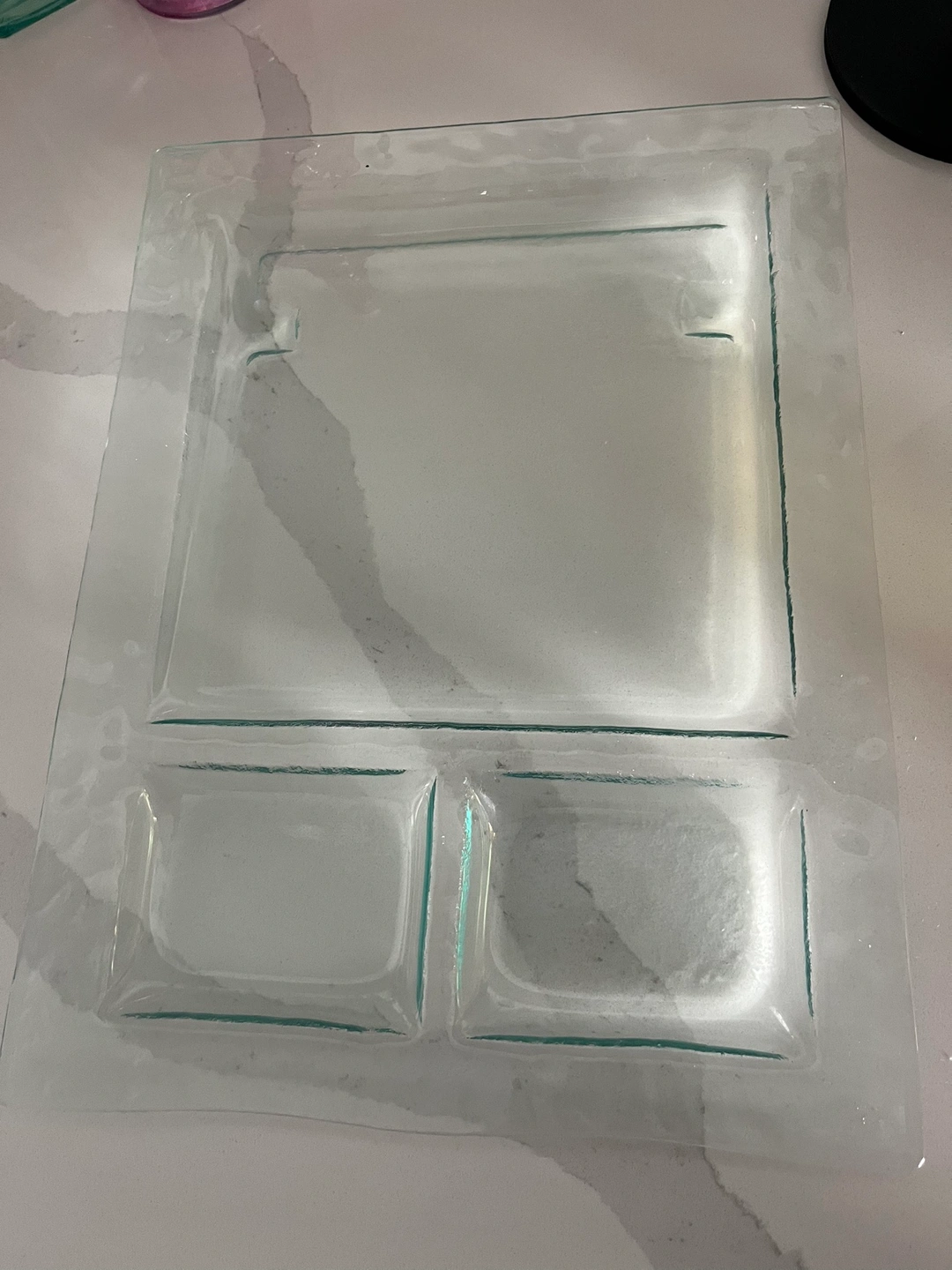 Sectioned glass platter with rippled border. Great for fruit, nuts, cheese, crackers, or to serve appetizers with two sauces. Edges have some character and aren’t completely straight. 14.5” x 11”. Available for pickup in Markland Wood.