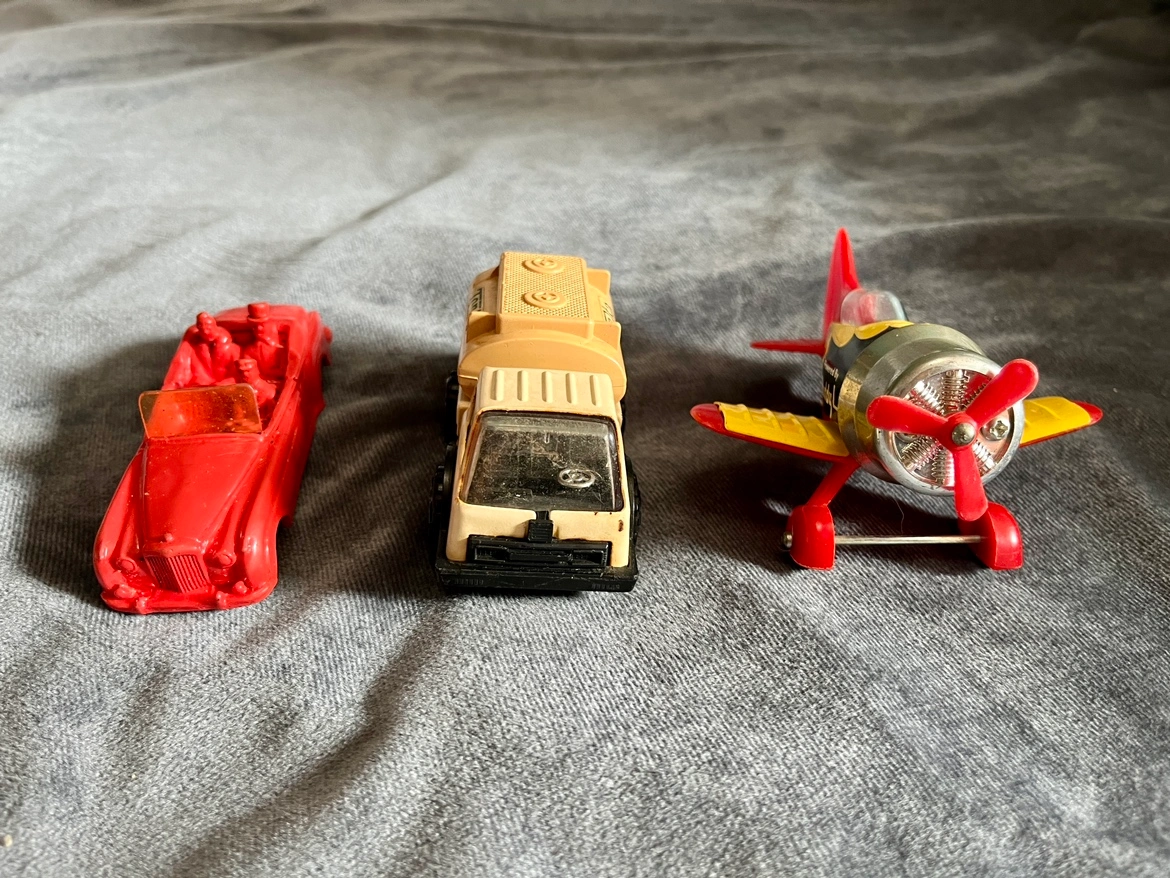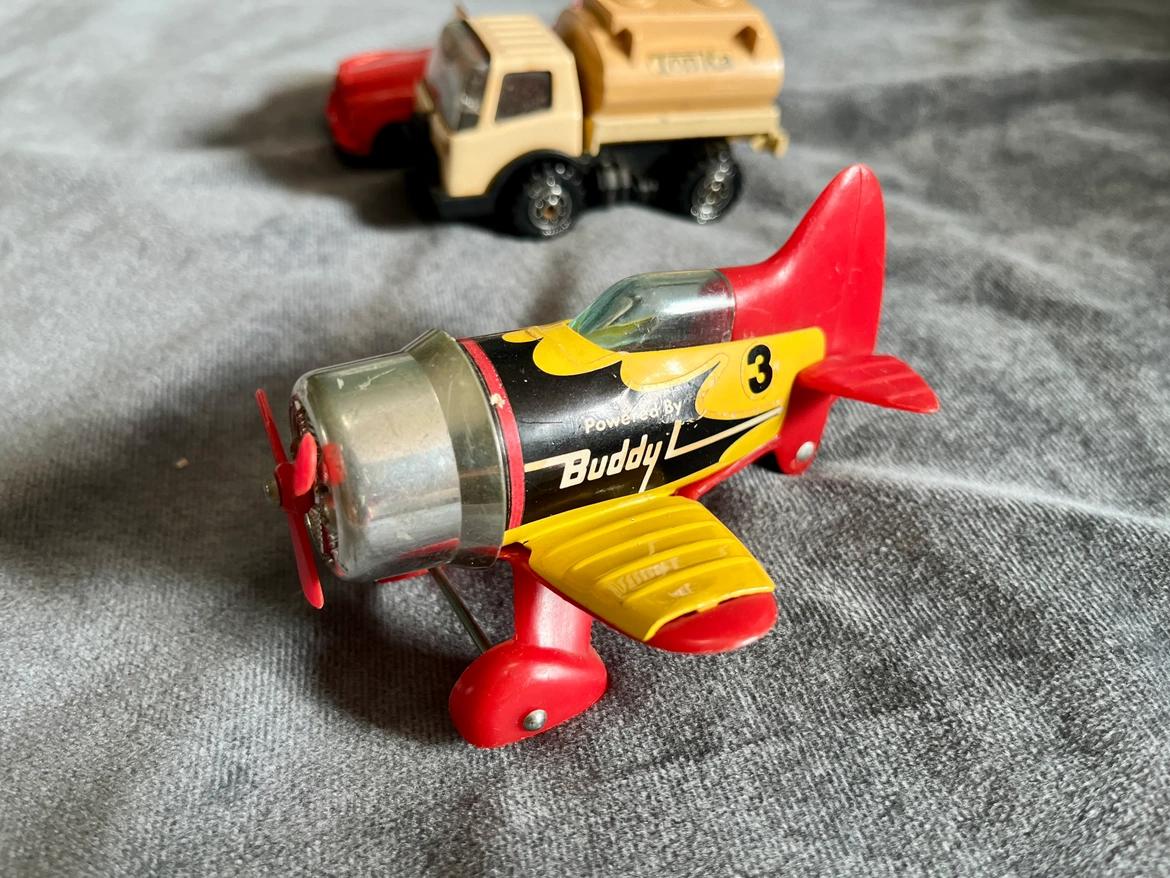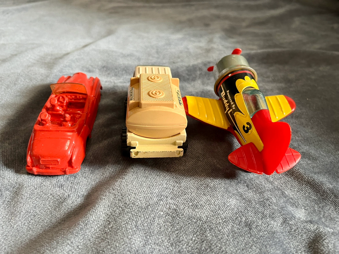 $20 for 3 vintage vehicles from 1970s (or $10 for 1). All in used condition. Includes: - Red Tomte Laerdal Stavanger Bentley (rubber) - Tonka fuel tanker truck made in Japan (metal and plastic) - Buddy L yellow & red Sky Racer #3 Airplane Single Propeller Plane 1978 Pickup only. St Clair W and Spadina Road area.