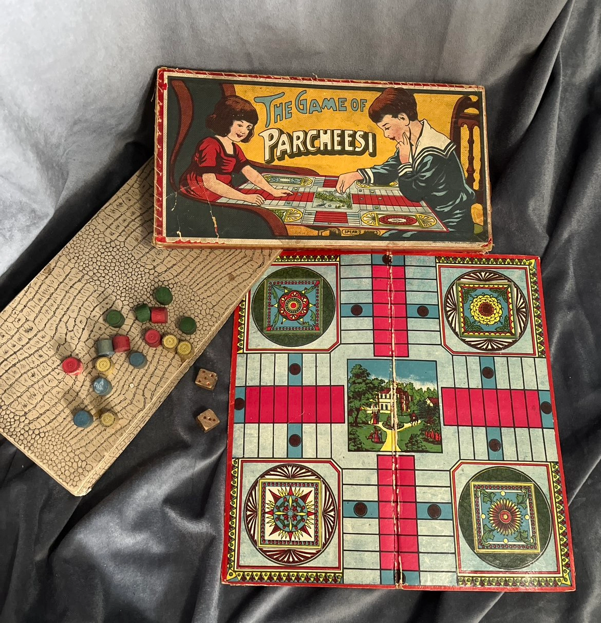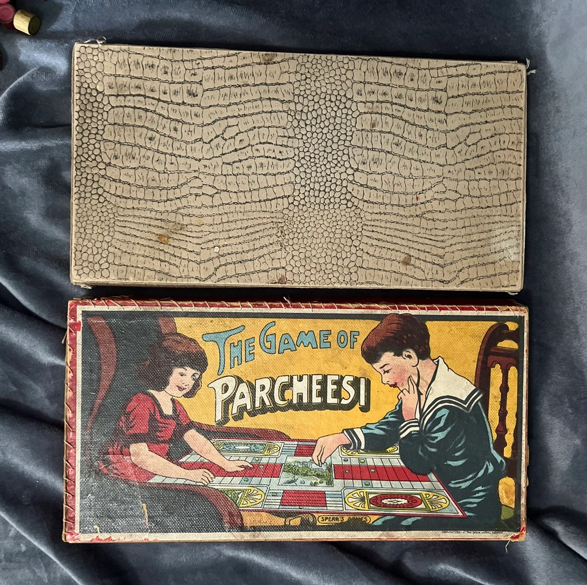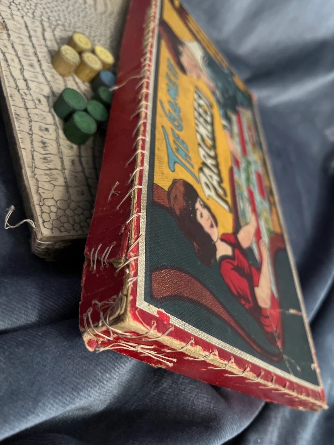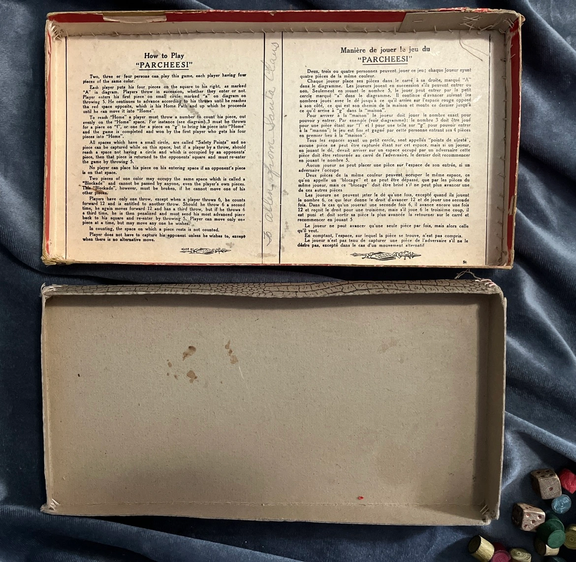 According to the Hamilton Toy Museum, their near-identical game of Parcheesi may be from the 1930s. The game I’m selling looks like it pre-dates their version based on the more simple game pieces. A version listed on eBay with the same pieces as mine notes early 1900s. So I’m not totally sure! It was made in Germany by Spears Games. Includes its original pieces and game board. The game is old and shows lots of wear. Its box has been sewn back together and has some damage as pictures. Written inside in pencil is “To Allen from Santa Claus.” Pickup only. St. Clair West & Spadina Road area.