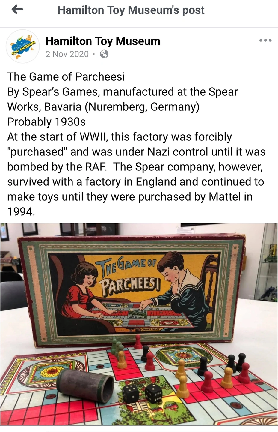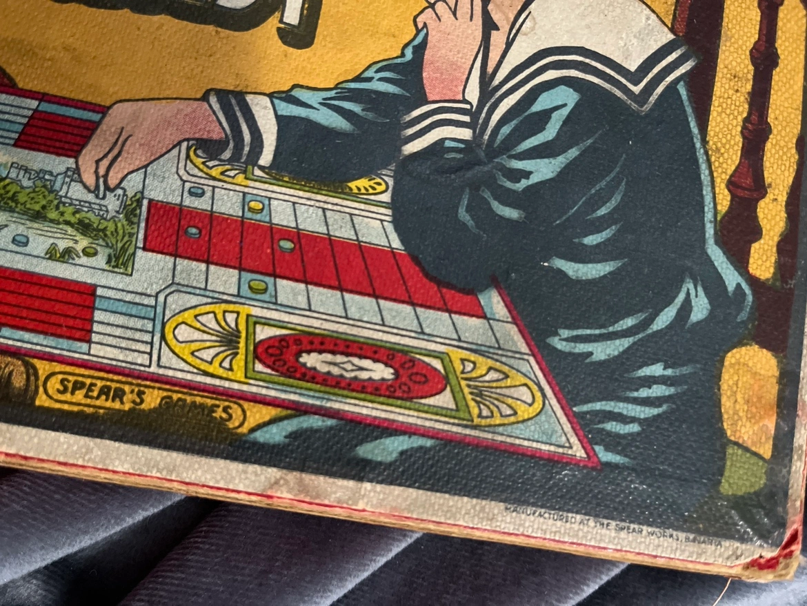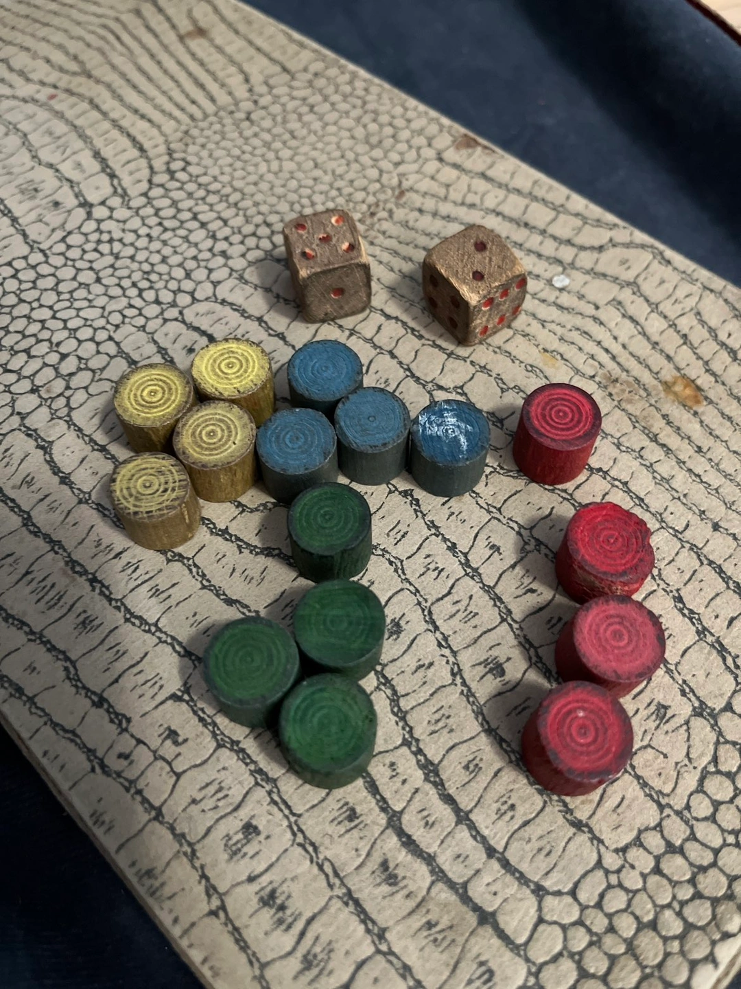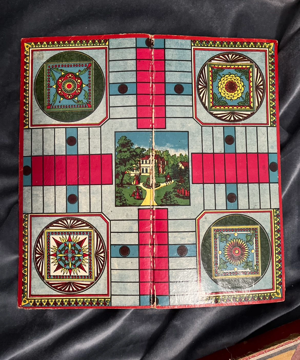 According to the Hamilton Toy Museum, their near-identical game of Parcheesi may be from the 1930s. The game I’m selling looks like it pre-dates their version based on the more simple game pieces. A version listed on eBay with the same pieces as mine notes early 1900s. So I’m not totally sure! It was made in Germany by Spears Games. Includes its original pieces and game board. The game is old and shows lots of wear. Its box has been sewn back together and has some damage as pictures. Written inside in pencil is “To Allen from Santa Claus.” Pickup only. St. Clair West & Spadina Road area.