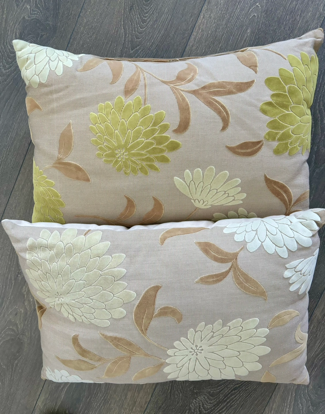 A set of two throw pillows with a light brown background and embroidered white and green flowers. No zipper on covers. Can be laundry washed. No wear and tear. Used for staging then occasional use on a couch in the past.