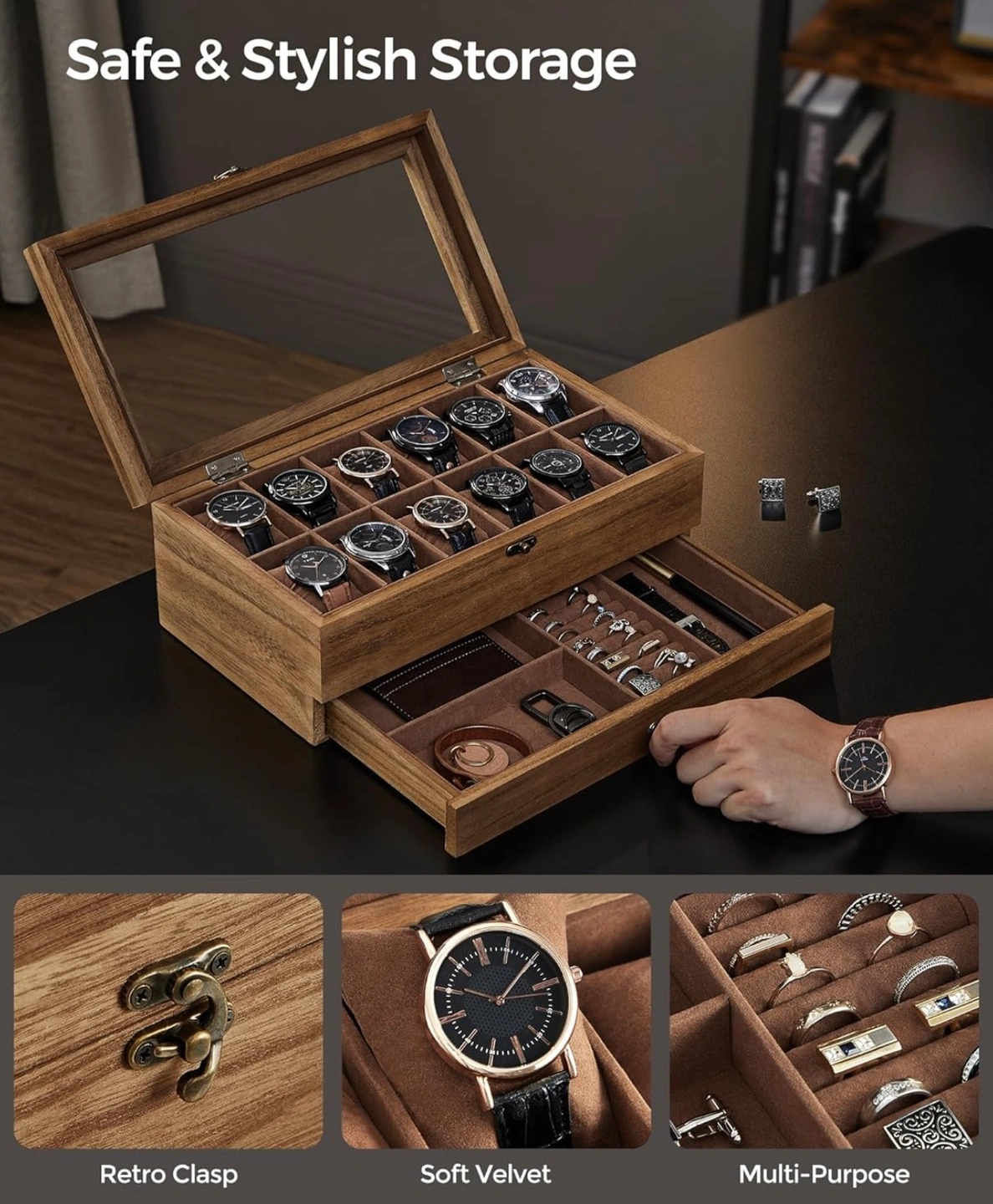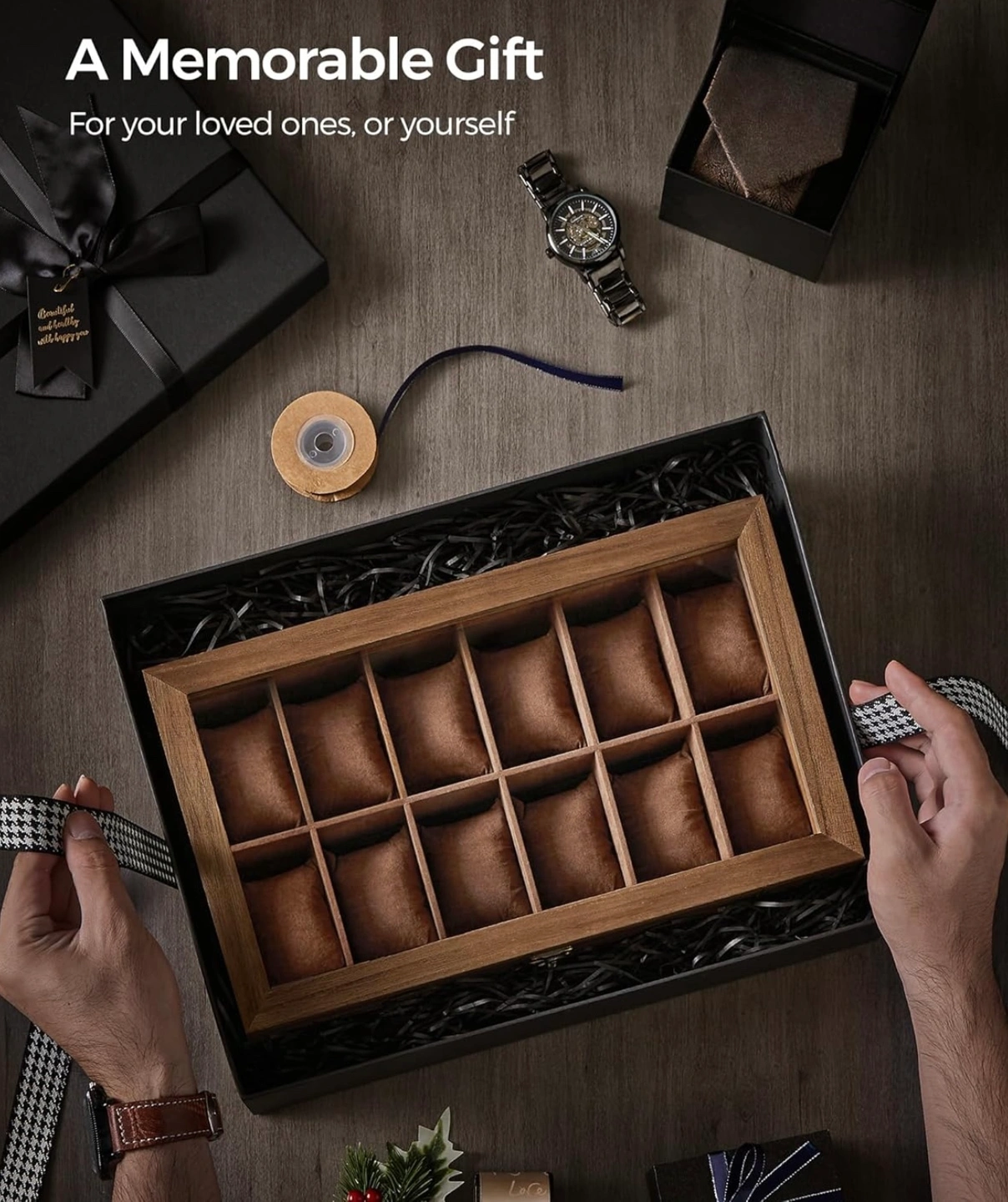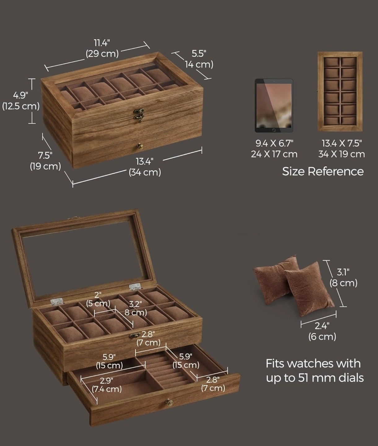 96Crafted with a sturdy wood frame outside and soft velvet inside, this watch box offers all-around protection for your watches from accidents and scratches. The soft-yet-supportive pillows keep them in good shape
