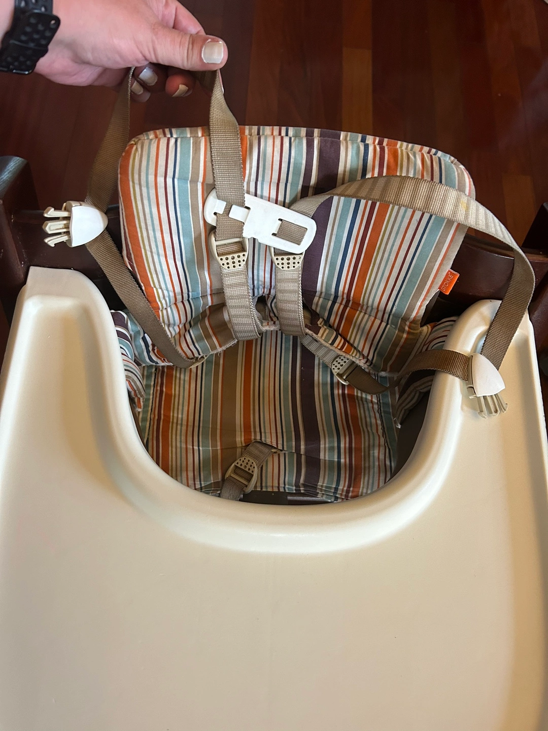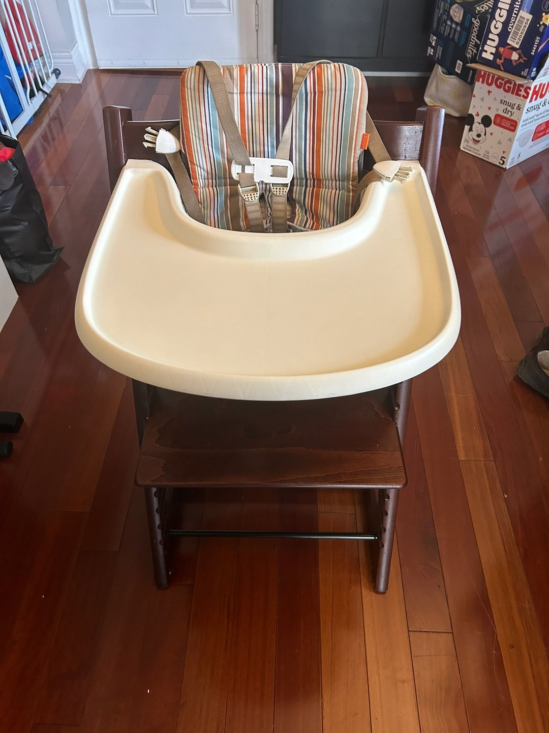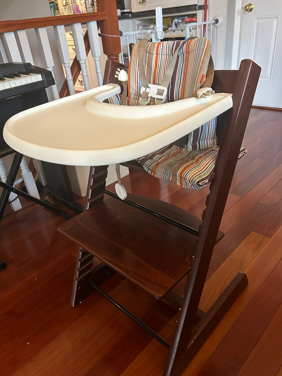 EUC Stokke high chair ! Dark wood high chair With five point harness tray table and washable covers! EUC !