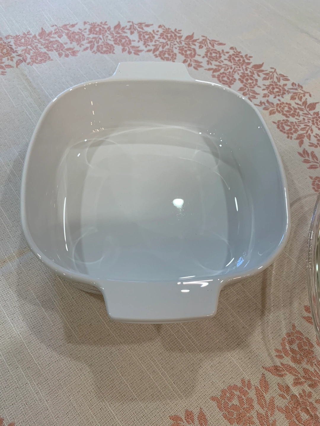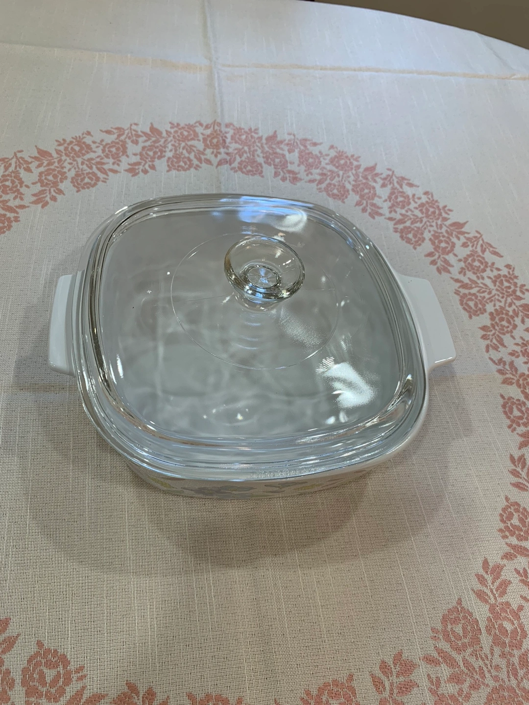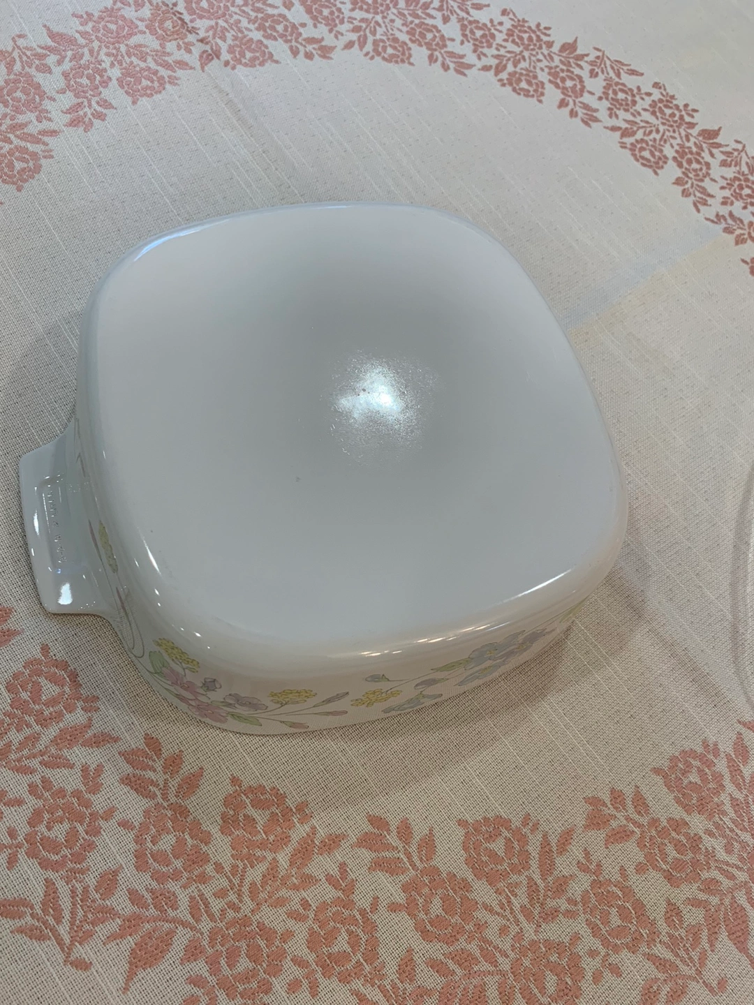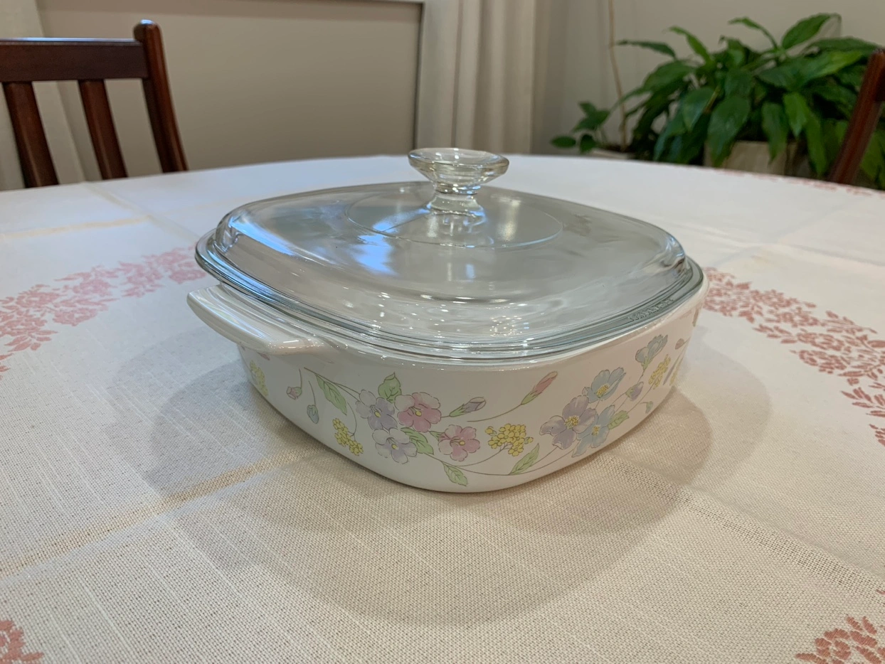 Corning Ware pastel bouquet 2 liter casserole dish has an elegant design. The floral pattern uses pretty pastel colors. The square pan is in great vintage condition showing little wear. The design is also in great condition. The pan is free from chips and cracks. This beautiful Corning Ware will look good in any kitchen.