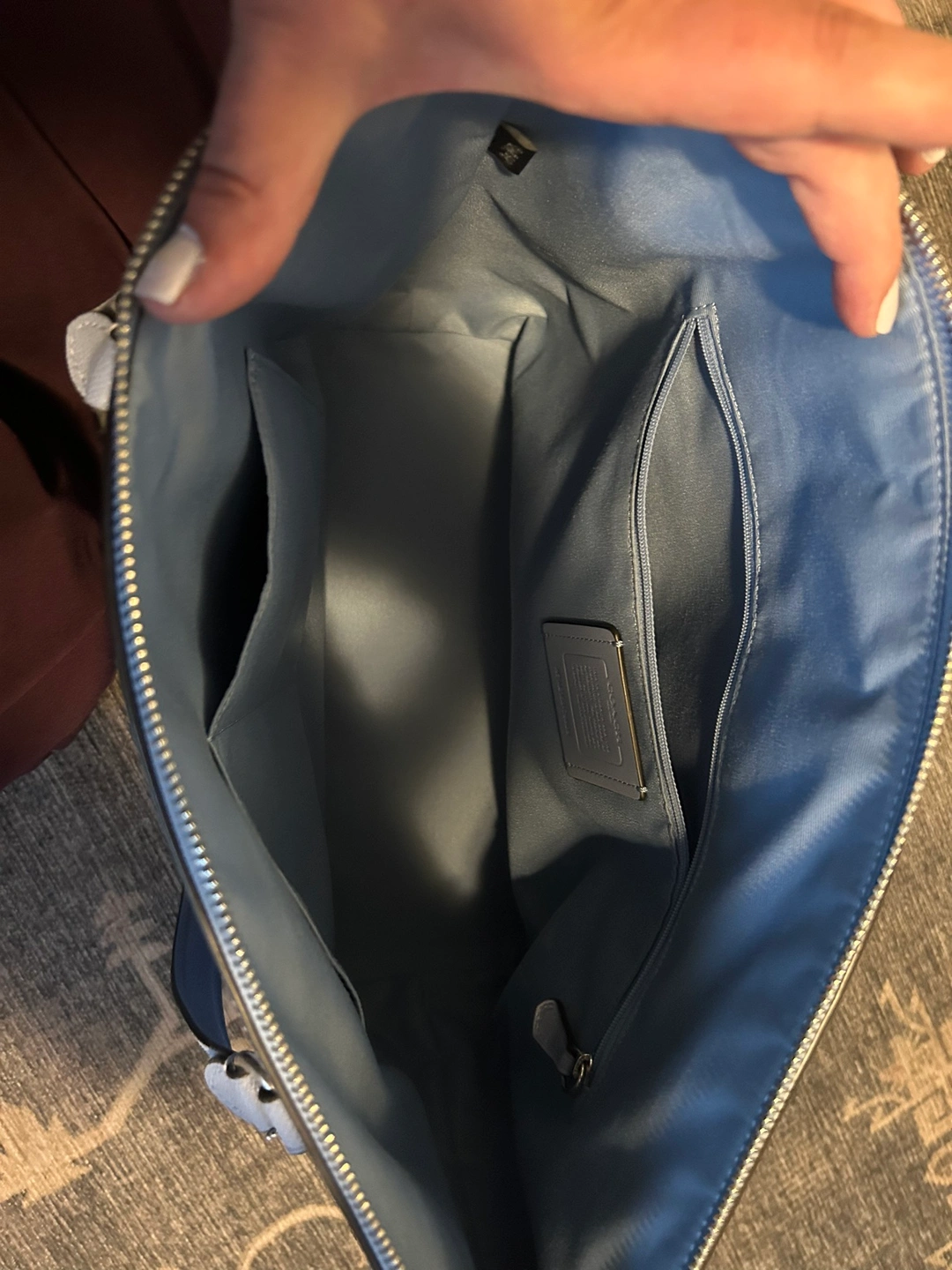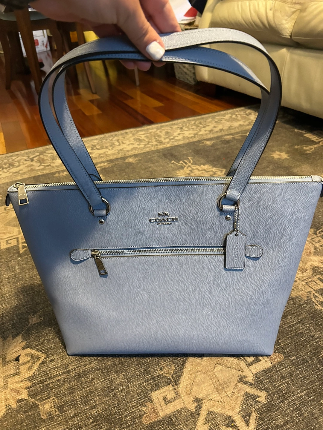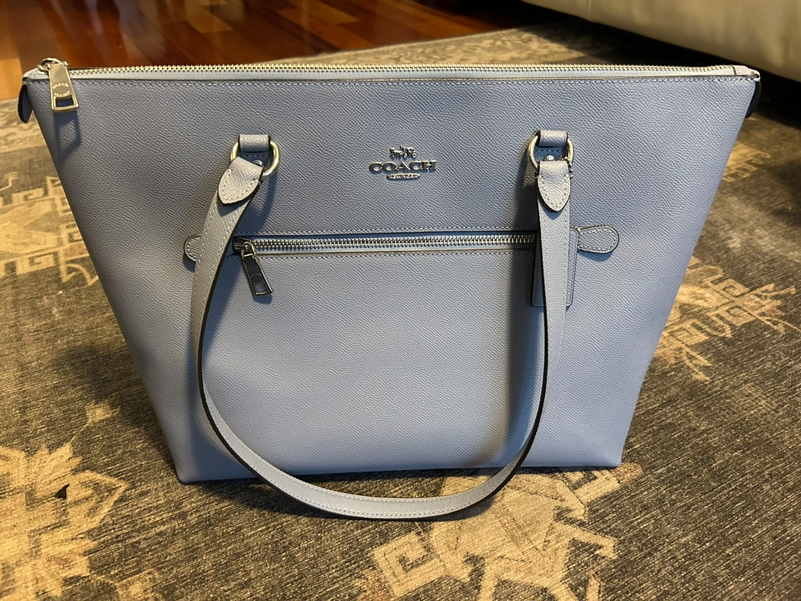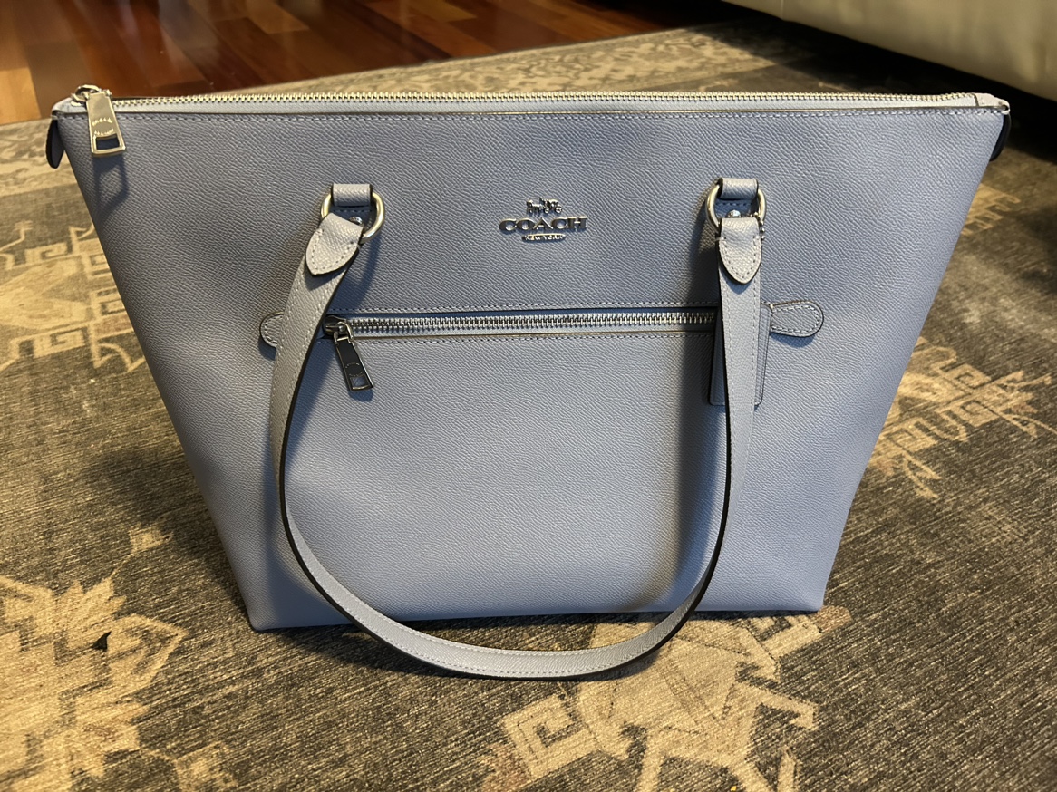 Beautiful coach bag - stands up just lovely on a table or desk - baby blue - pristine condition! Several pockets & zips Easily is placed on the shoulder & comfortably worn - 16” wide x 12” height can fit a laptop, or lunch, wallet, small portfolio excellent buy.